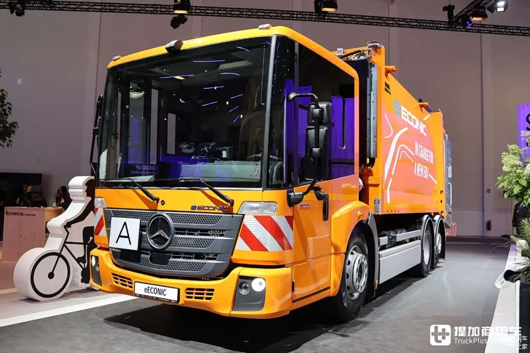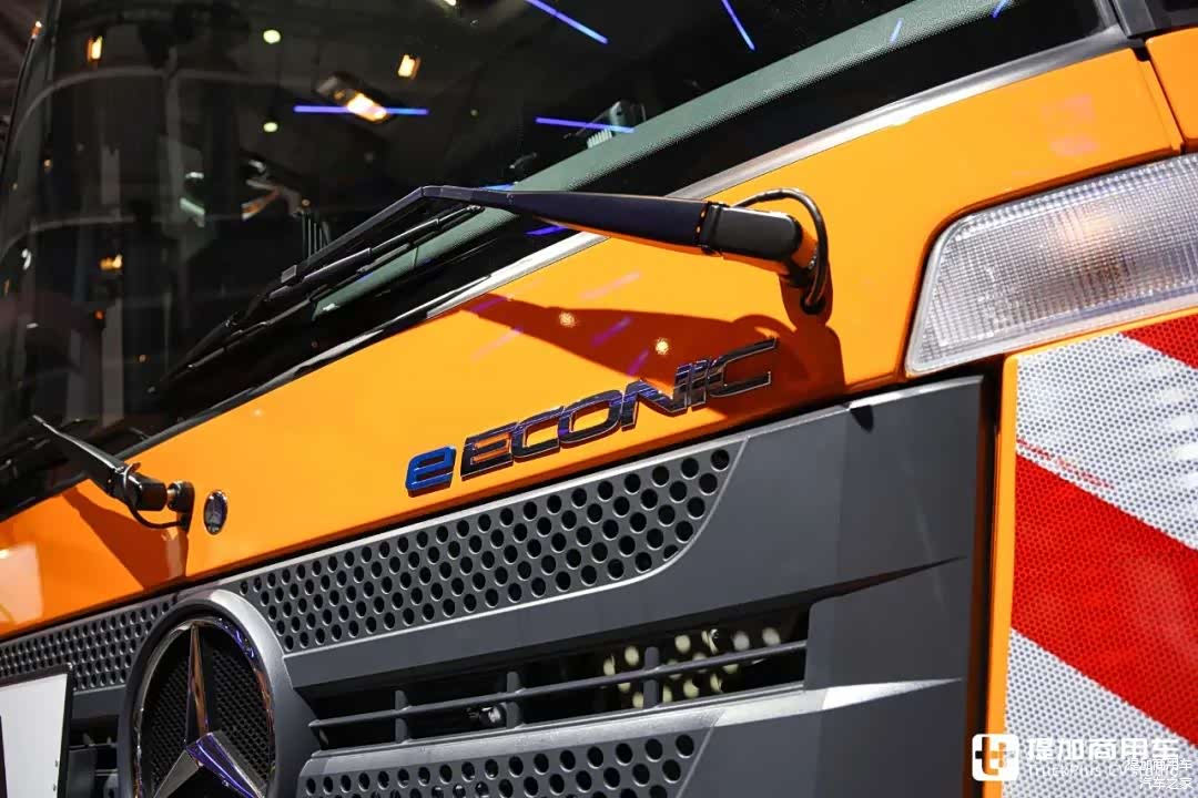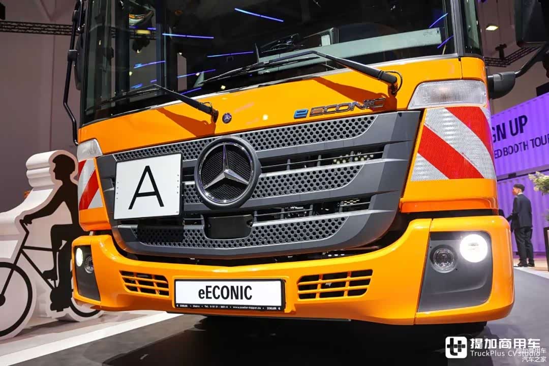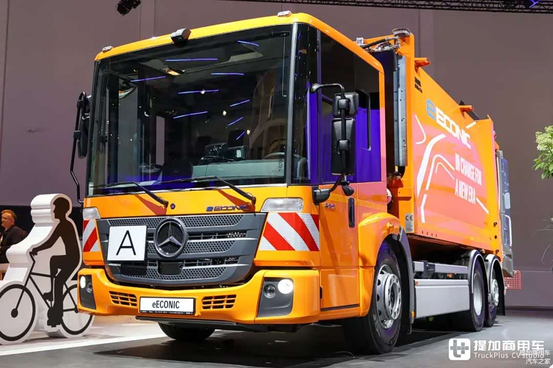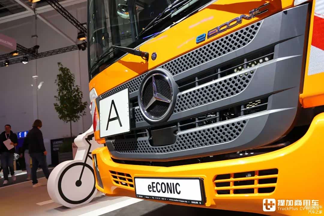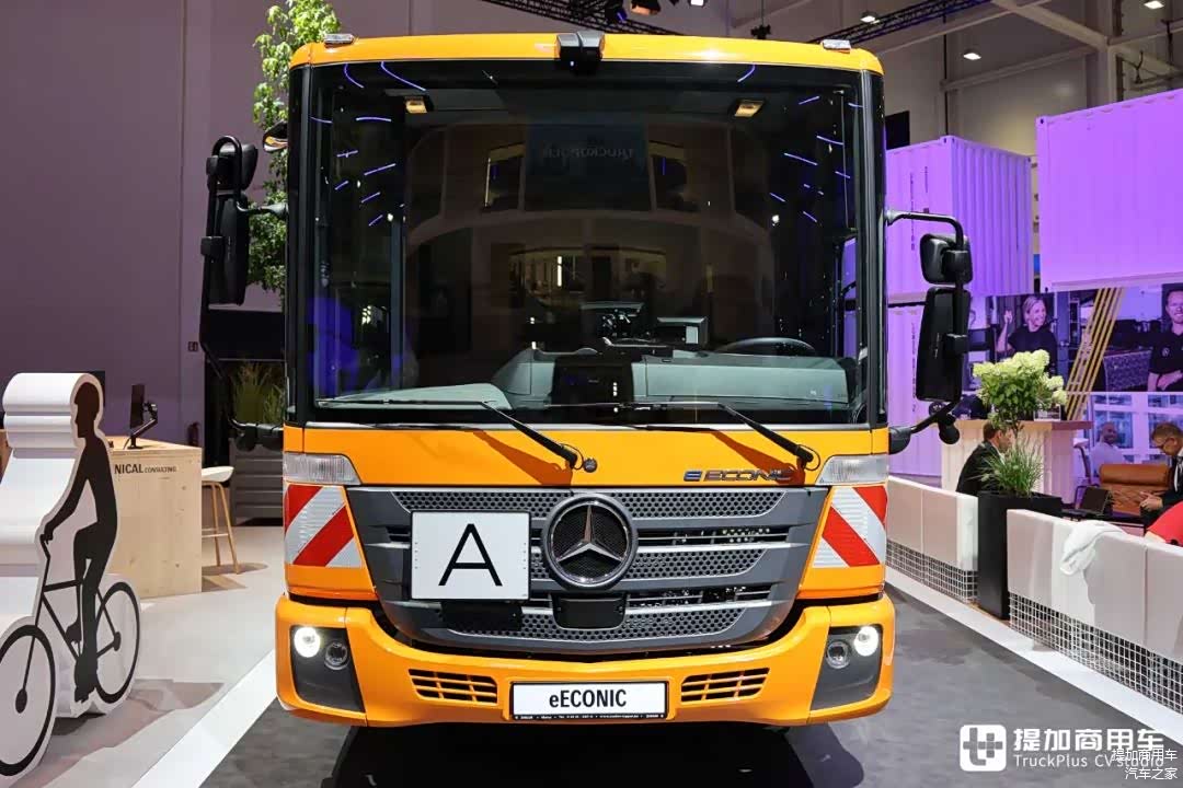 同时,展出的奔驰eEconic 300纯电动低入口卡车还在前脸上增加了一块字母A标牌。这块标牌代表车辆用于废物、垃圾的回收工作,是德国法律中的强制配置。
