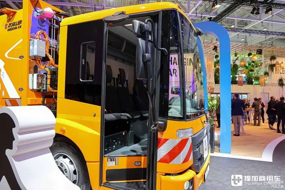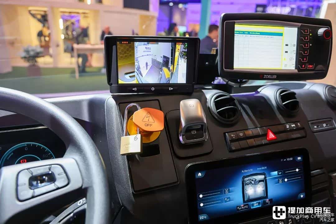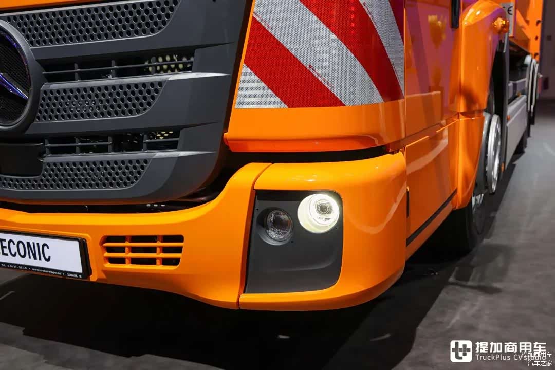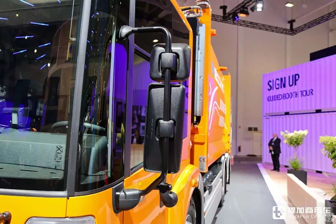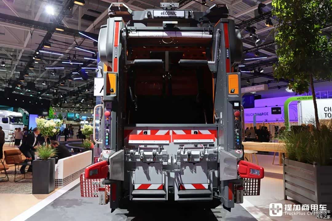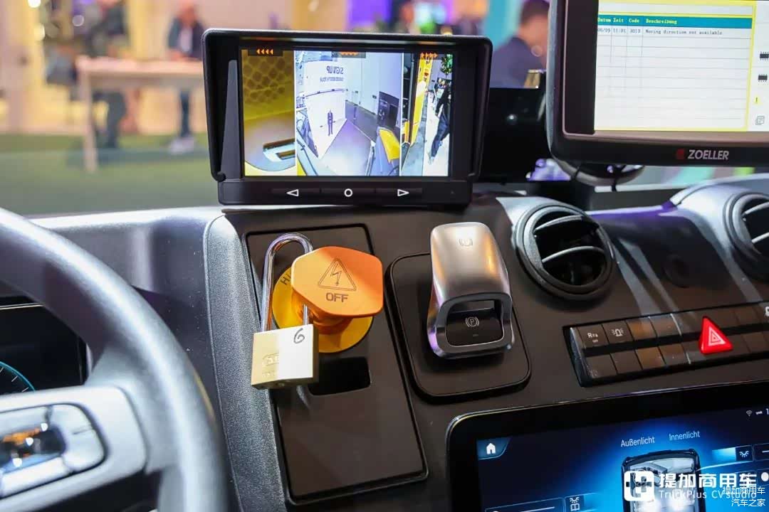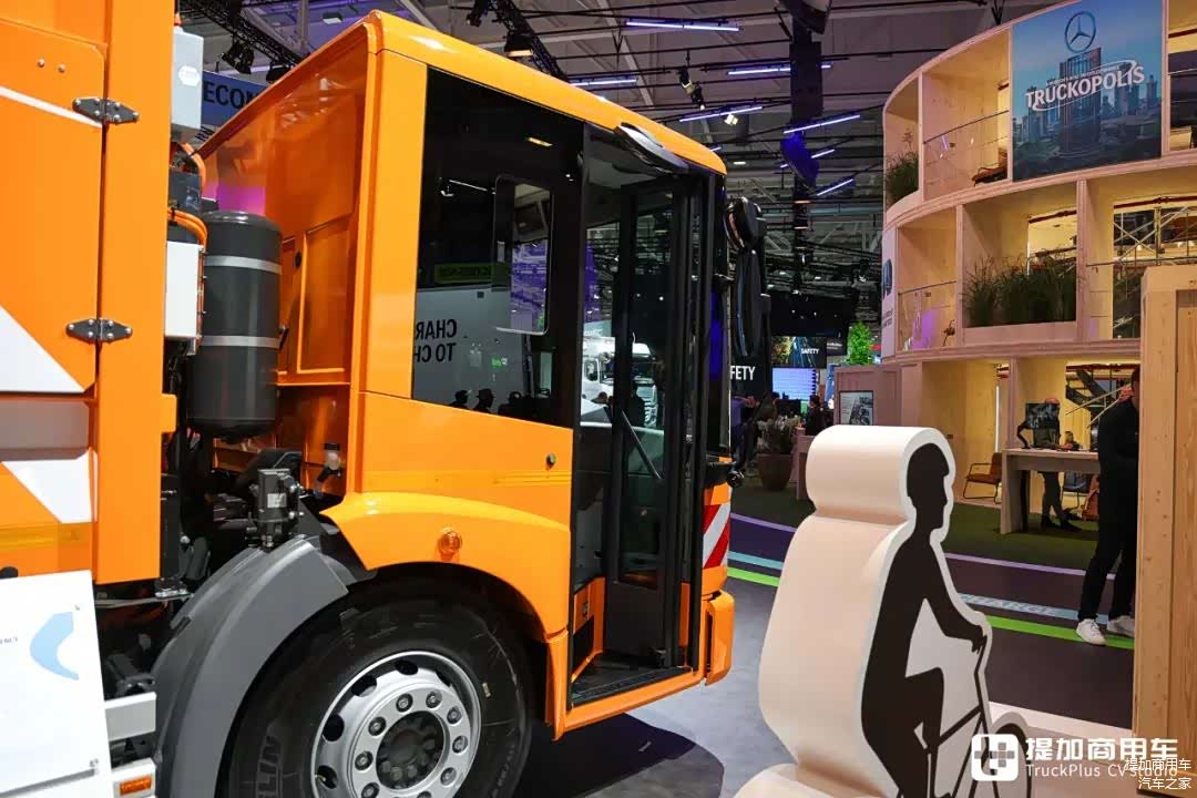 同时,展出的奔驰eEconic 300纯电动低入口卡车还在前脸上增加了一块字母A标牌。这块标牌代表车辆用于废物、垃圾的回收工作,是德国法律中的强制配置。