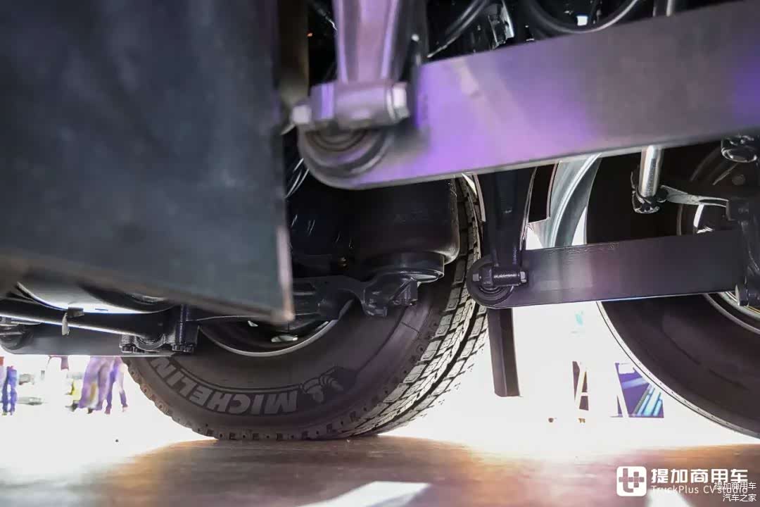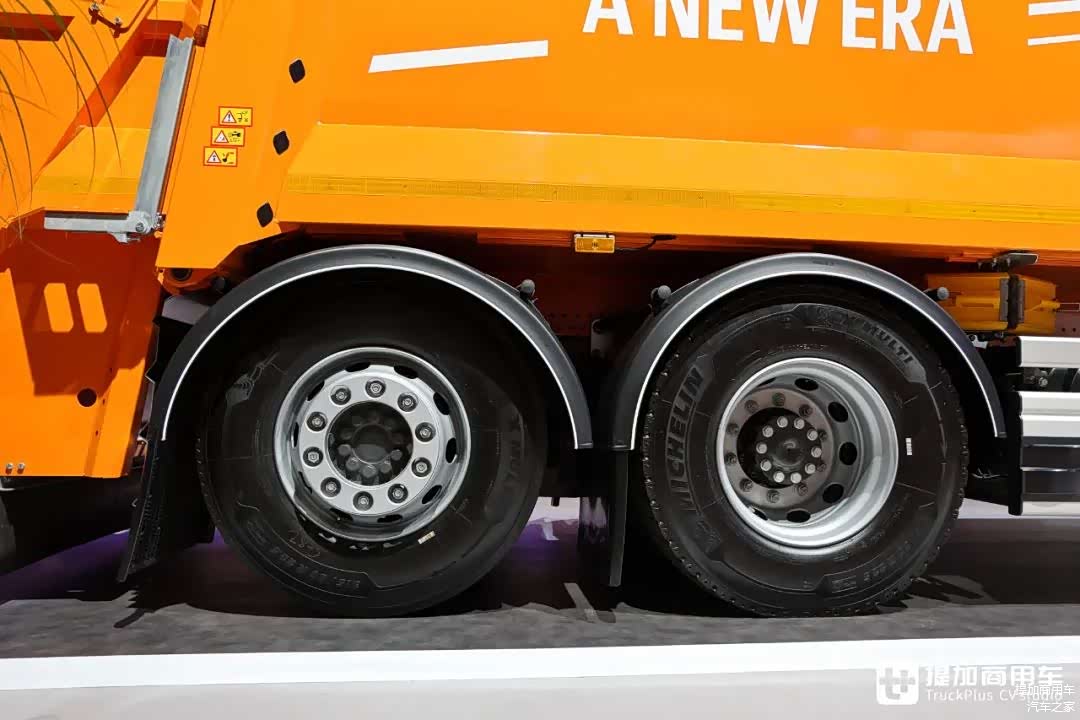 展出的奔驰eEconic 300纯电动低入口卡车采用了6x2的驱动形式。其中第二桥为驱动桥,采用空气悬挂。第三桥装配单胎,可实现随动转向功能,进而缩小车辆转弯半径,提升机动性。针对城市工况,奔驰为eEconic 300纯电动低入口卡车打造了电驱桥。它的持续功率达330kW(449马力),峰值功率达400kW(544马力),并集成2+2挡变速箱,通过不同齿比来适应不同的驱动工况。