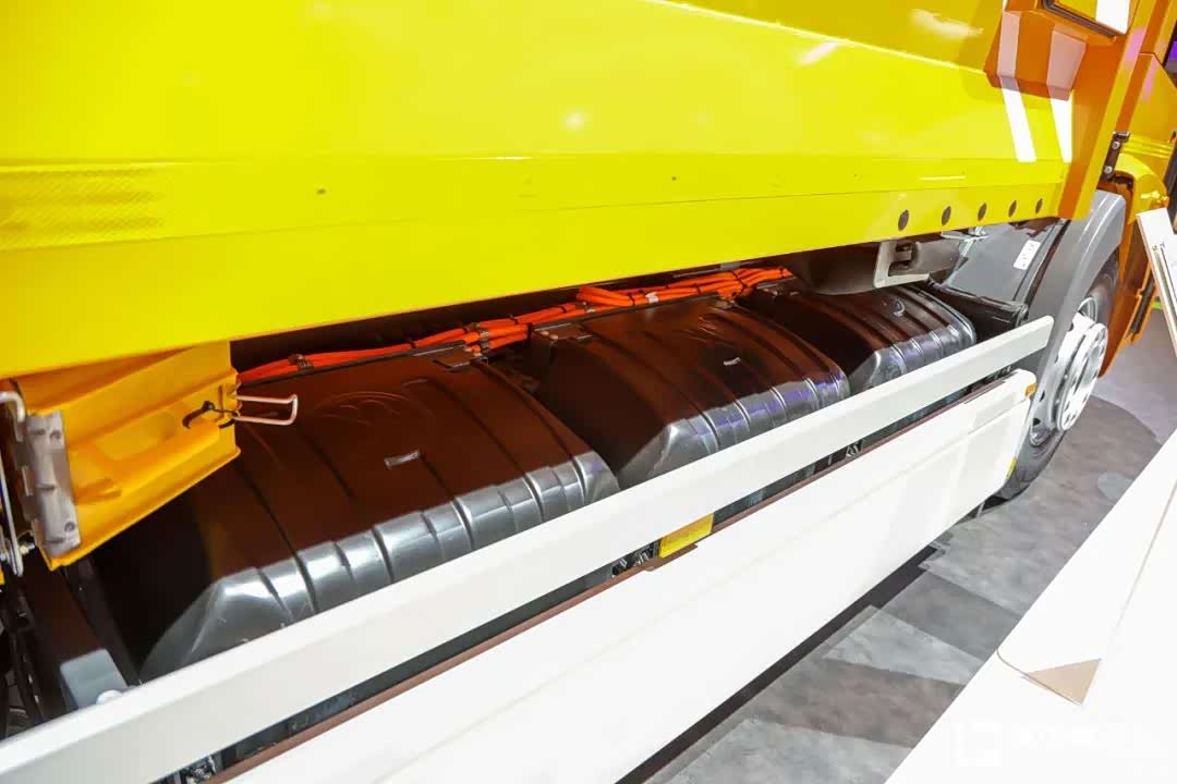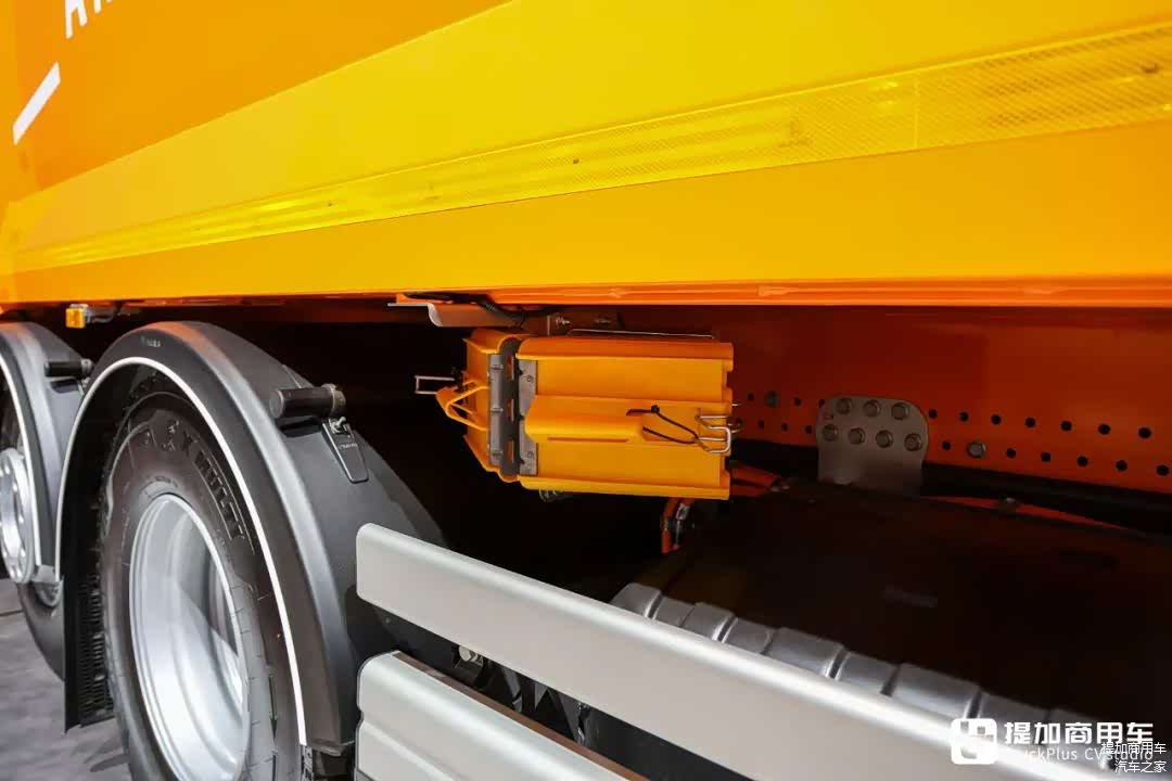 在电池配置方面,奔驰eEconic 300纯电动低入口卡车与eActros 300一类的车型共享技术。三组LFP磷酸铁锂电池采用下挂的方式与车架相连接,实现了更高的空间利用率。单组电池提供112kWh的电量储备,全车电量共336kWh,VETCO市政循环工况续航里程100KM,市政/区域配送/城市配送混合工况续航里程150公里。看起来续航里程很短,但要知道:驱动上装工作需要很多的电量,假如执行纯配送工况,车辆的续航里程将显著提升。