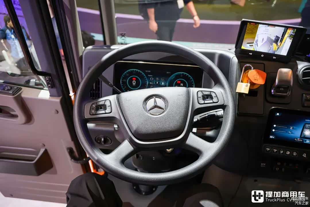 接下来,就让我们进入驾驶室感受一下。作为一台新时代的纯电动低入口卡车,奔驰eEconic 300采用了多媒体座舱。液晶仪表盘取代了机械仪表盘,并附加多媒体屏幕,智能化程度更上一层楼。方向盘也换成了最新的四幅式多功能方向盘,带有多个按键及触摸板,便于操控车辆功能。不过出于其市政车辆的定位,方向盘的材料更低一档,不如Actros上的真皮包覆+金属饰板装饰。