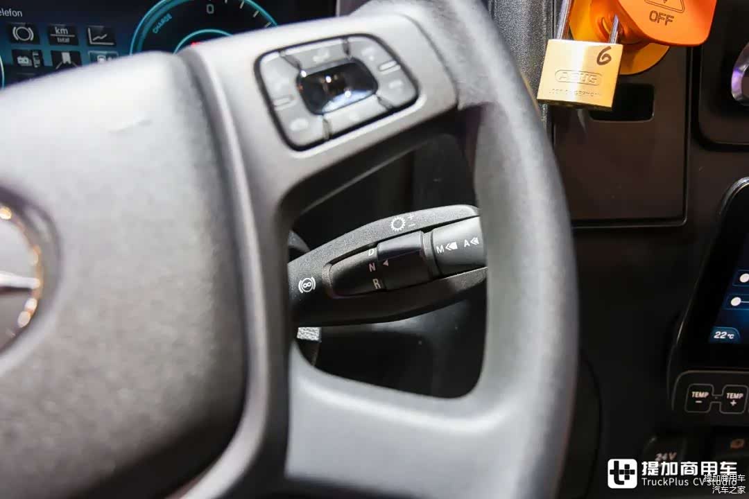 换挡采用怀挡方式进行控制,位于转向柱右侧,与其他奔驰卡车形成家族化设计