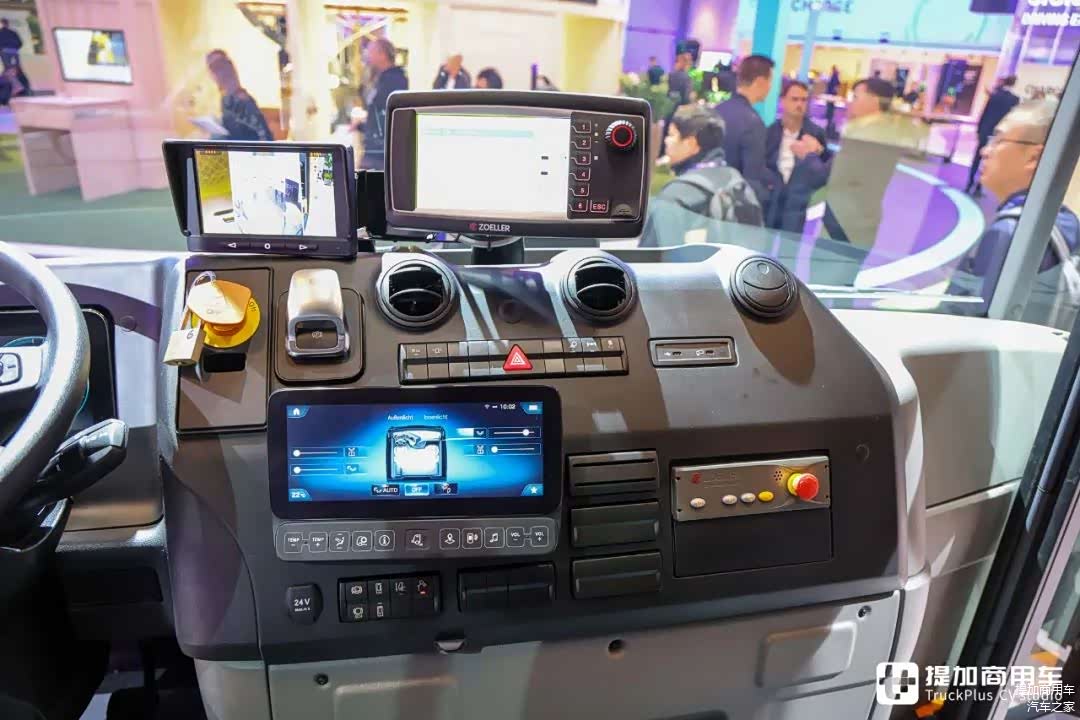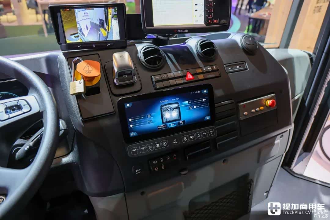 奔驰eEconic 300纯电动低入口卡车的仪表台采用平直造型,而非环抱式,能够为车内让出更多空间,便于人员在车内周转
