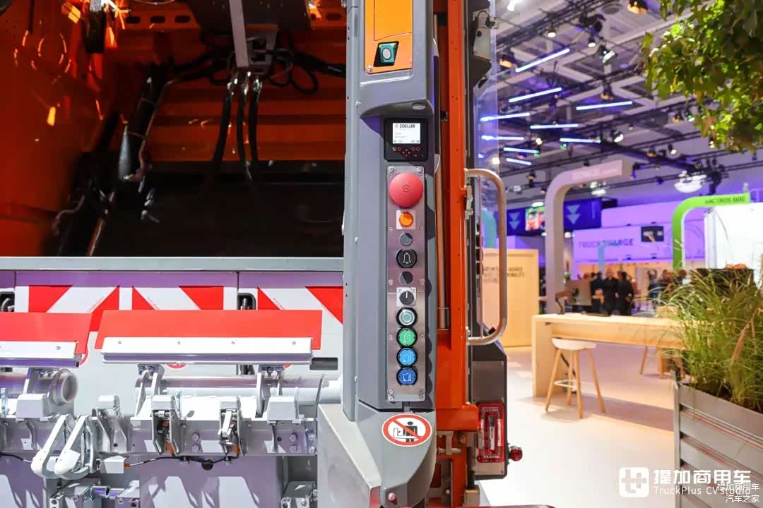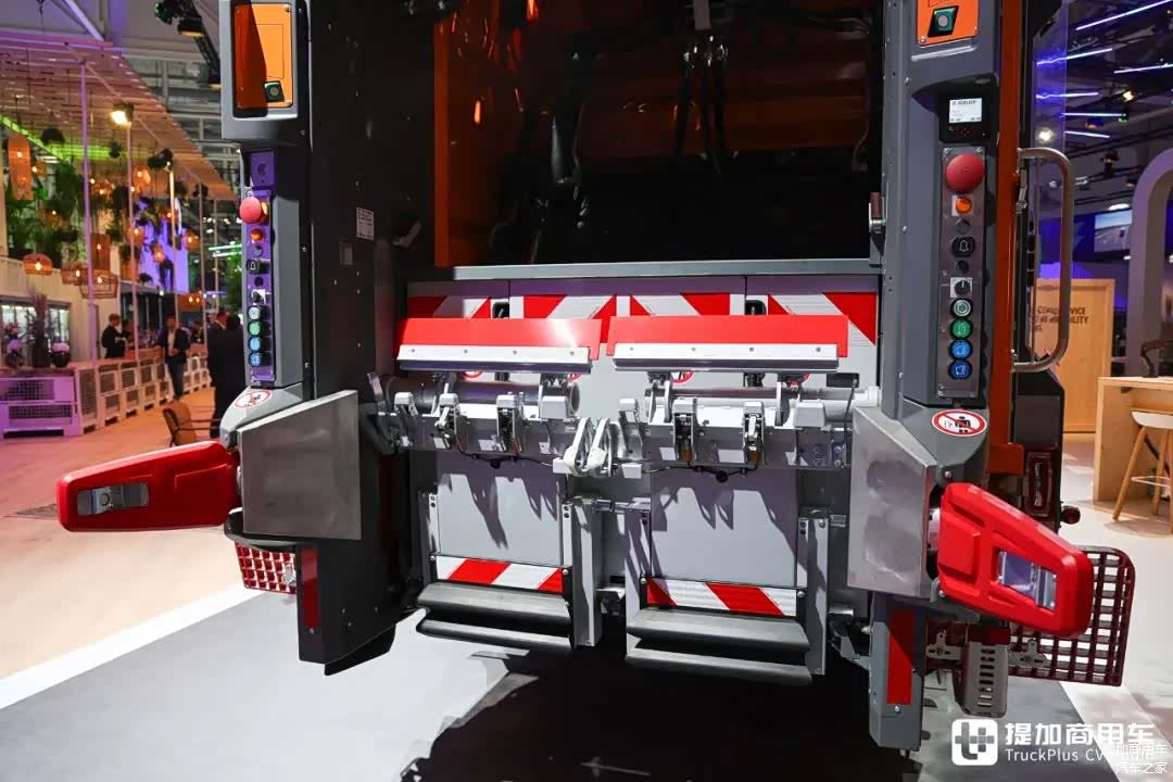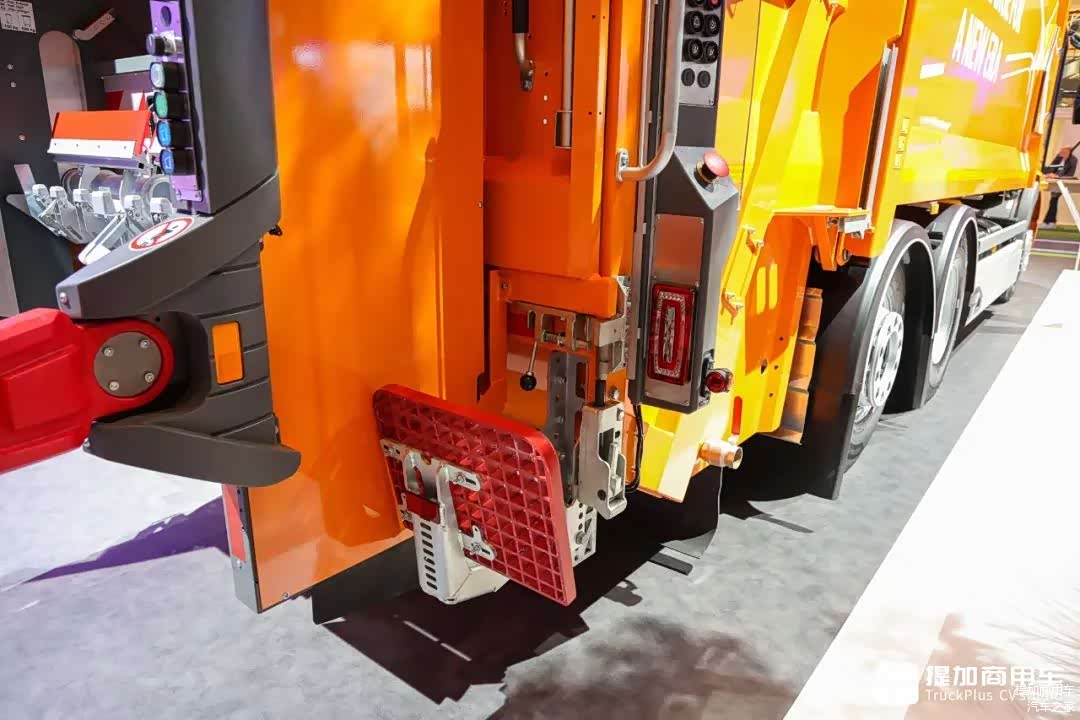 在上装方面,这台奔驰eEconic 300纯电动低入口卡车搭载了后装式压缩垃圾车上装,这也是奔驰Econic车系家族的常见用途:城市垃圾回收。该车上装由德国Zoeller Kipper公司打造,型号为Medium X4,属于该公司的主力中型压缩垃圾车上装产品。