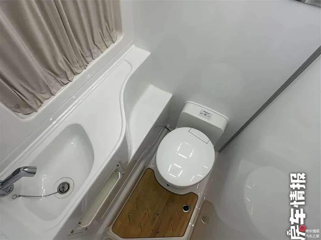 另一侧是车内的厨卫区域,提供了电磁炉、洗菜池、冰箱以及一个空间比较宽敞的卫生间。对于一辆房车而言,这些功能可以不用,但必须要有,毕竟出门在外什么情况都有可能发生。