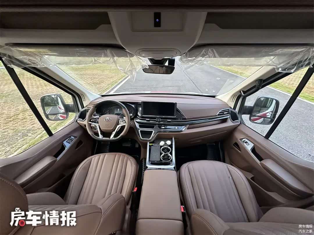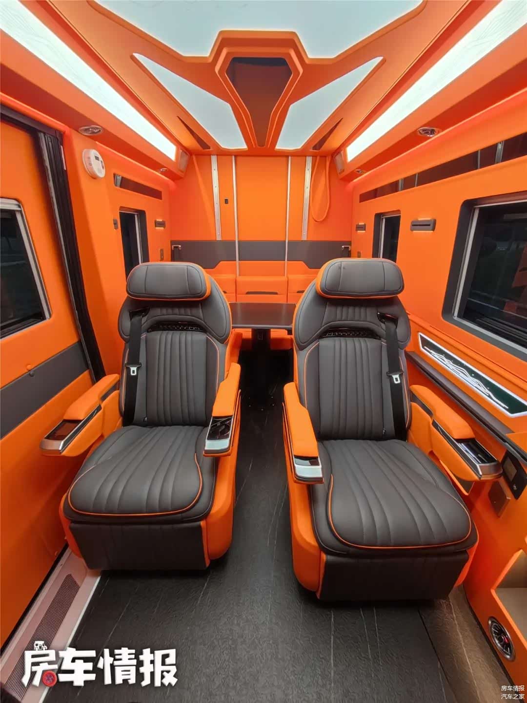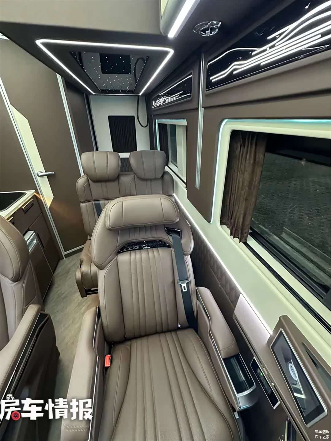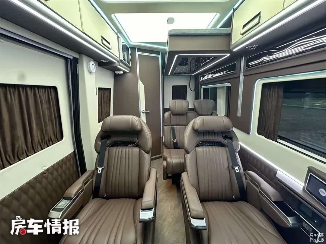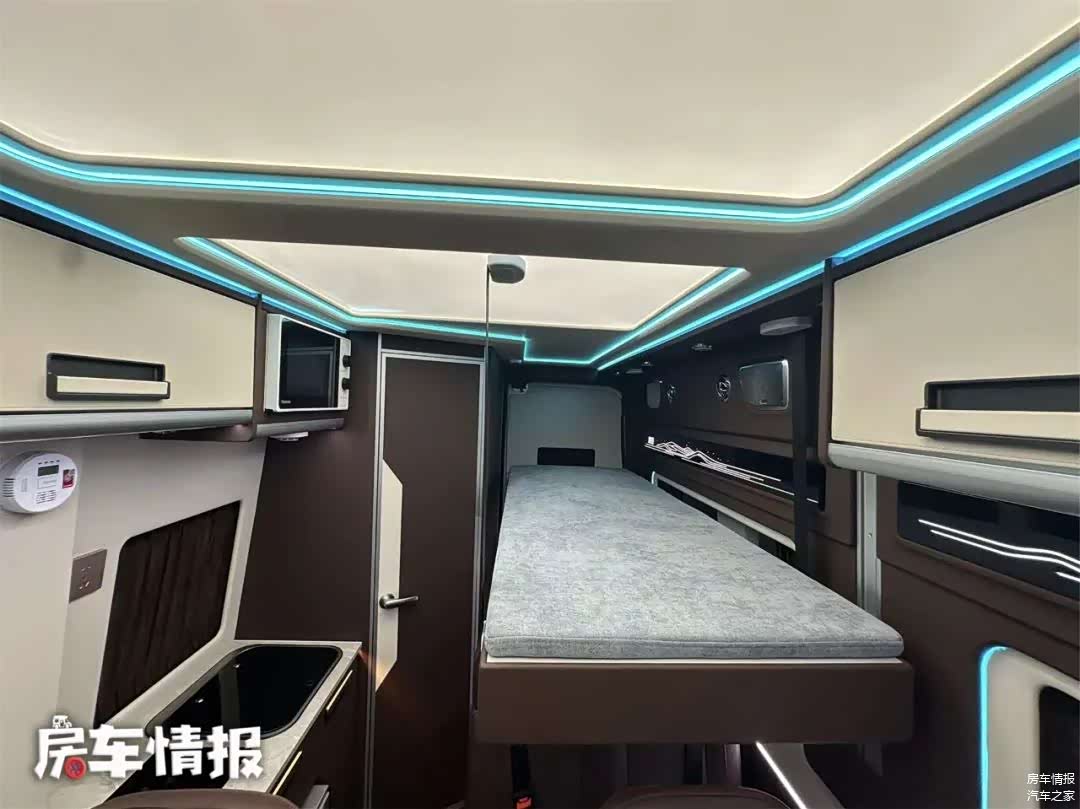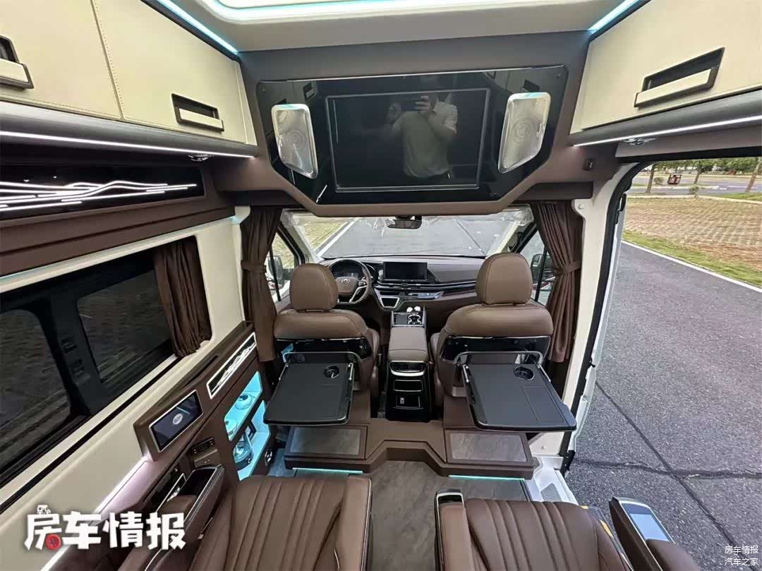 进入生活区,内部的整体设计氛围完全是向商务车看齐,整车采用超纤皮包覆、高分子地板,搭配精致的氛围灯,给人的感官完全不输那些基于福奔改装的商务车。
