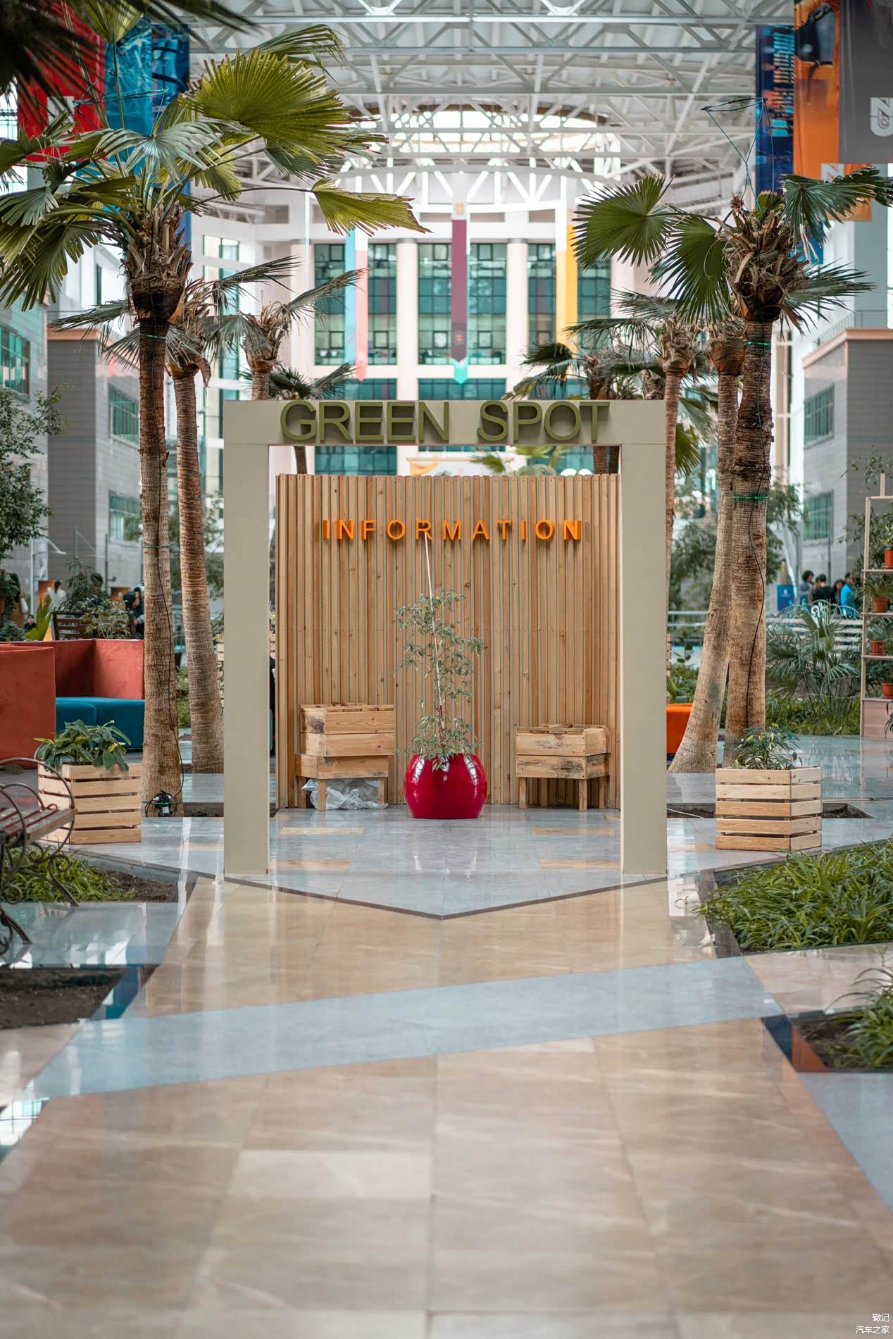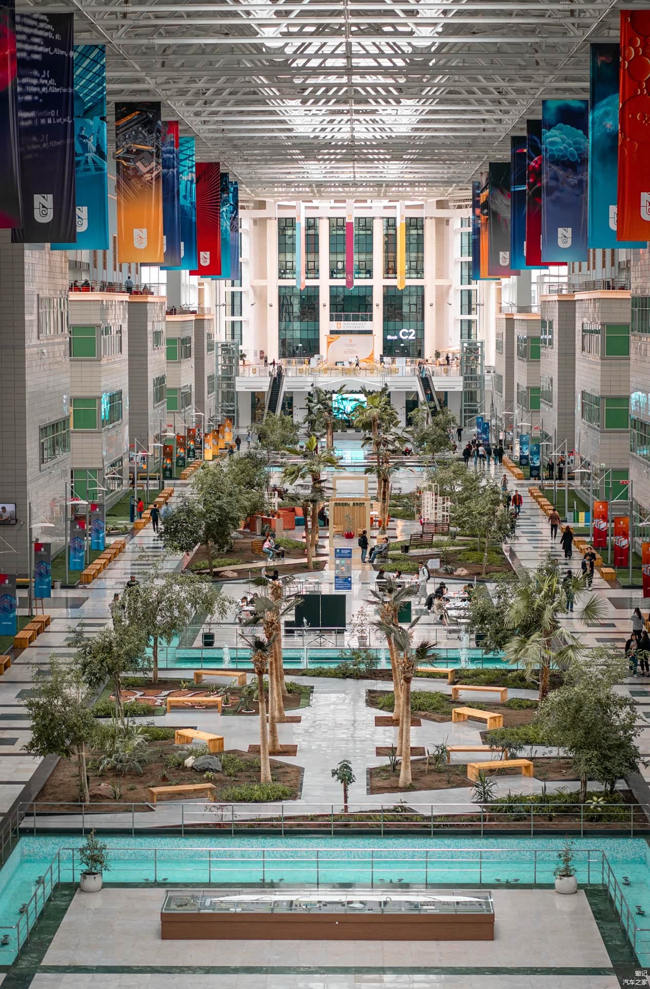 从学校大门进入主教学楼,先经过安检通道,径直走入校园中庭,仿佛置身于一片“室内桃源”,把森林搬进室内,简直是天然的氧吧,令人心旷神怡。