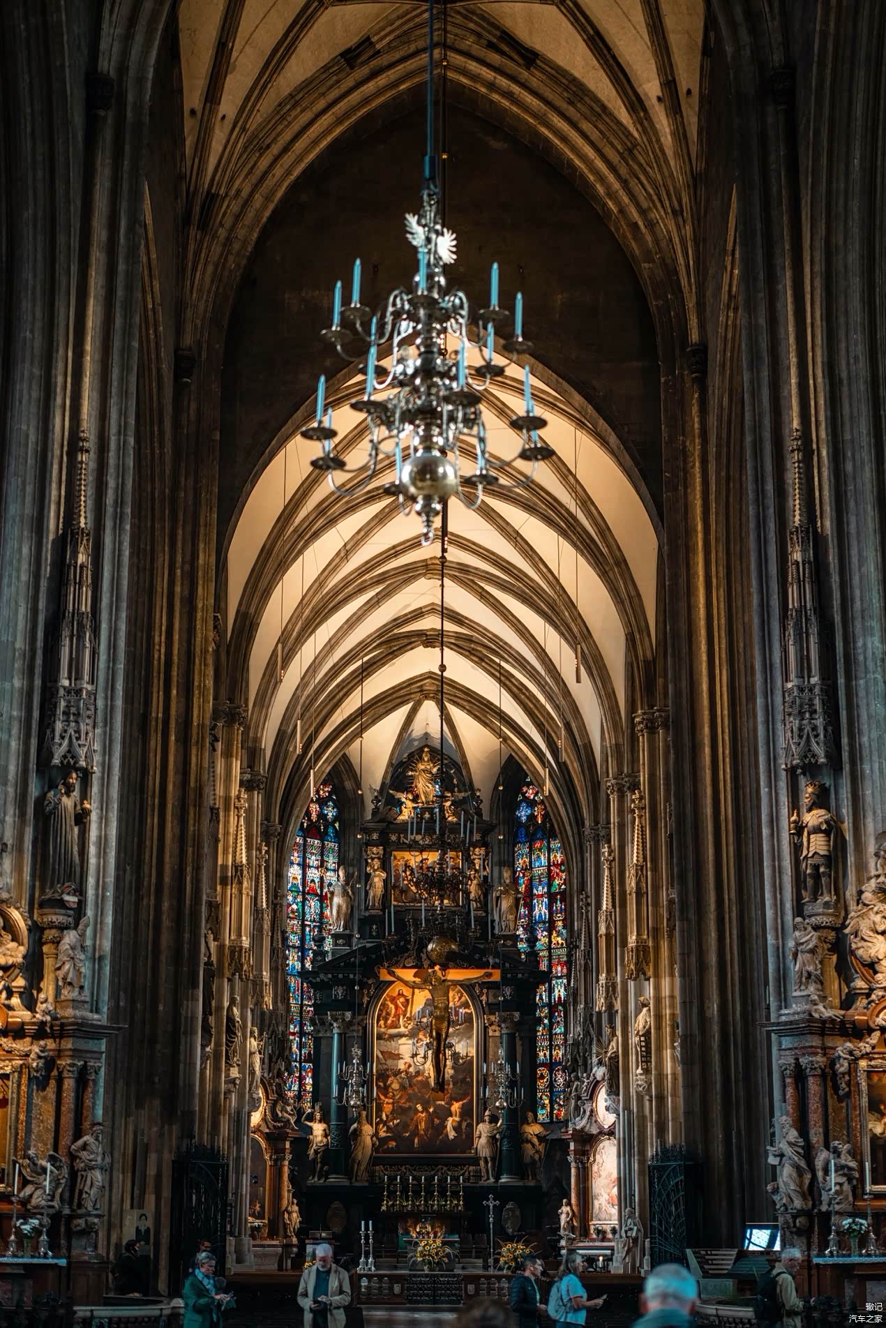步入教堂,首先映入眼帘的是宏伟的哥特式讲坛,是由安东·皮尔格莱姆塑造而成的。整座教堂的内部建筑浩繁精美,两排哥特式的柱子,把教堂的正殿隔成三部分。在教堂内部绘有大面积的色彩缤纷的图案纹,被誉为有“维也纳的精魂”。