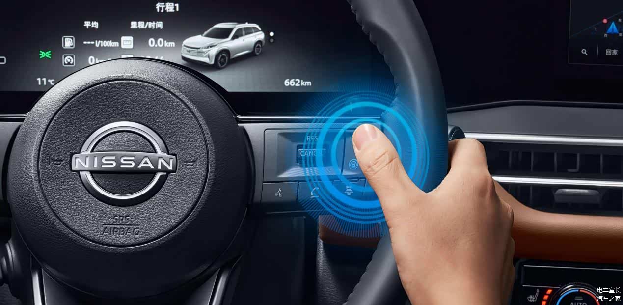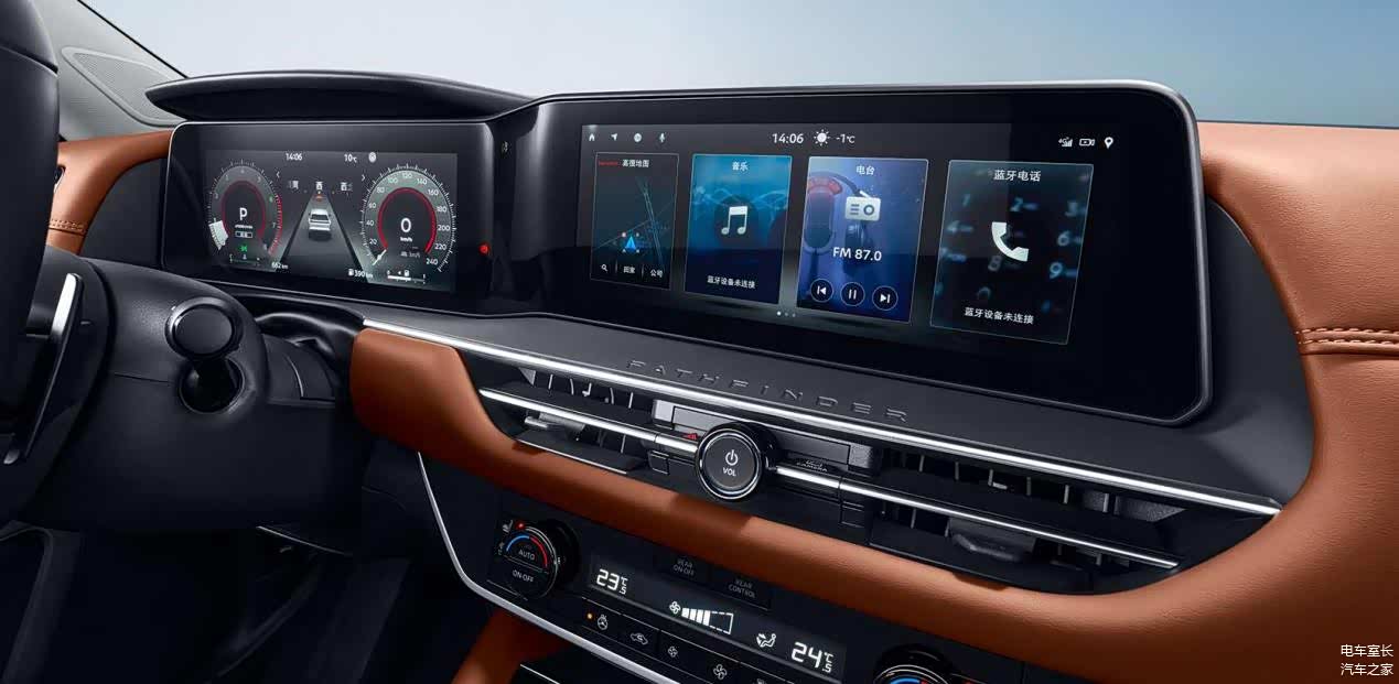 此外,日产探陆为了满足国内消费者对于智能座舱的需求,装配了一体式12.3+12.3英寸双联屏系统。该系统搭载了Nissan Connect超智联2.0车机,可实现4G联网,支持手机APP远程操控,以及双音域语音指令操控等功能。