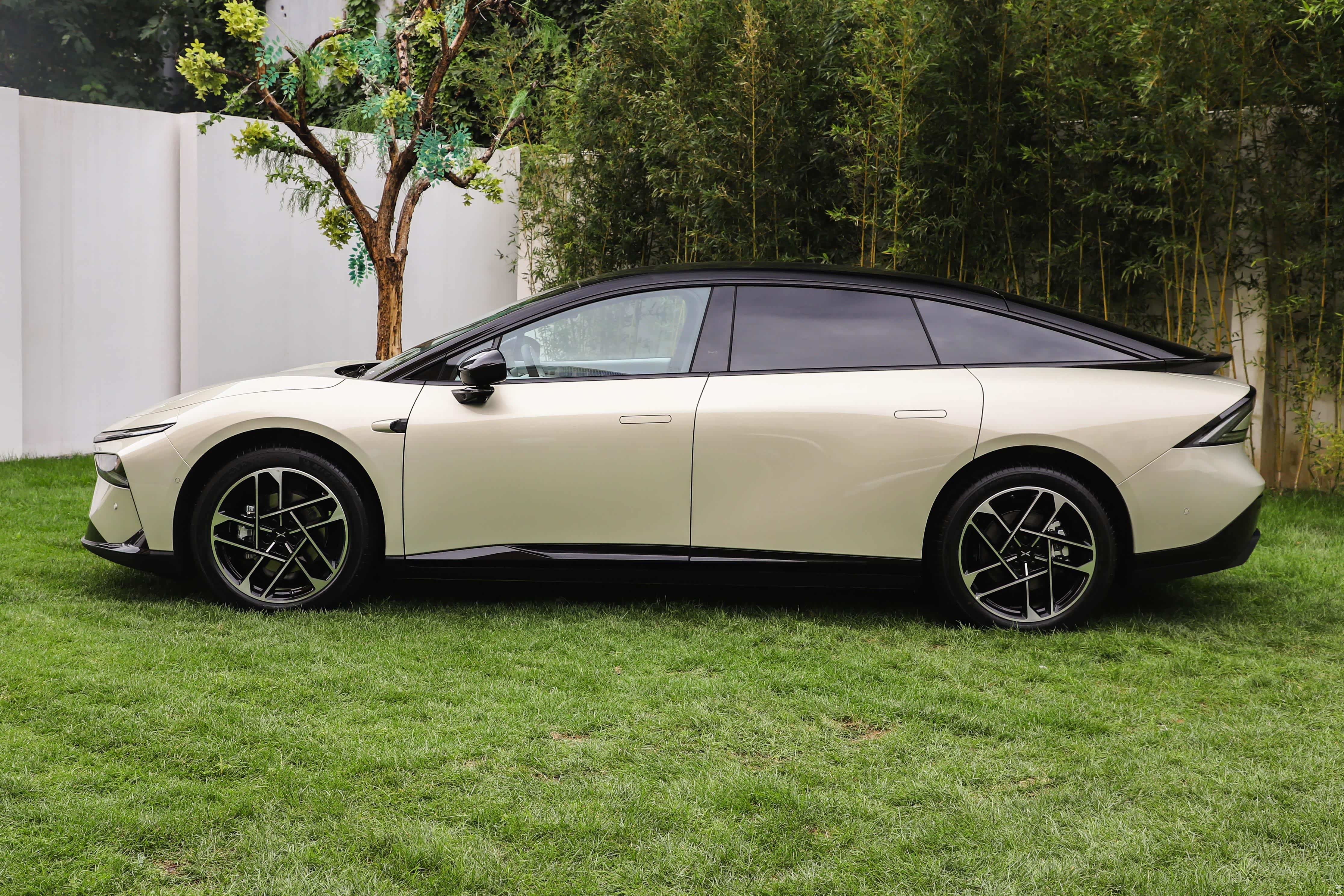 从侧面看,新车是很紧凑的,前后悬都很短,加上夸张的悬浮式的车顶,使得整体的姿态非常蓄势待发,据官方说法,新车为中置超跑的黄金比例车身,视觉上的冲击力还是很强的。此外,后视镜采用了极简设计,镜面面积很大,颜值也很高,但是没有外壳的保护可能镜片受损的几率会比较大一些。