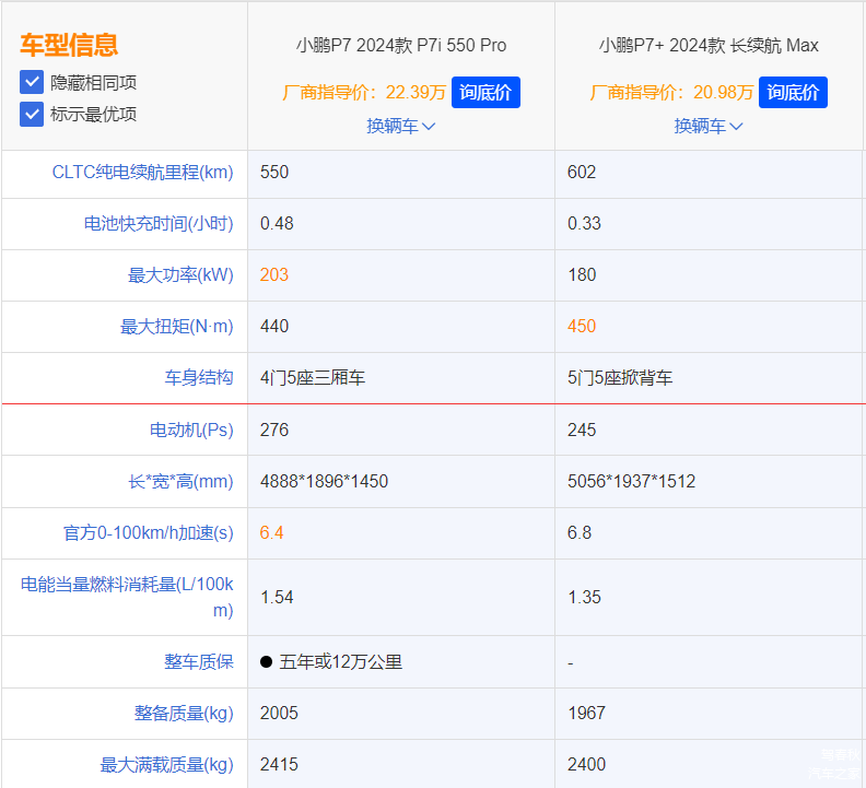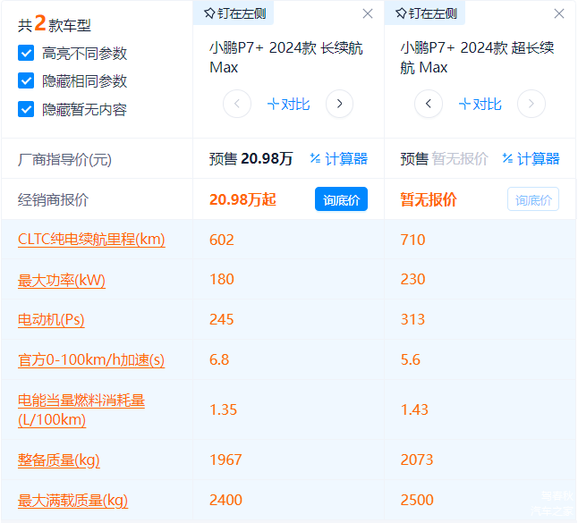 虽然小鹏P7+只公布了预售的起售价格,但是还有一款名为小鹏P7+超长续航 Max的版本。那么它与预售价20.98万的长续航Max版都差了什么呢?