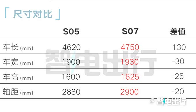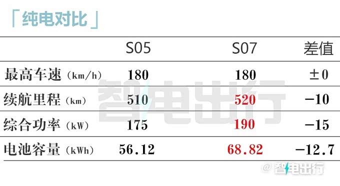 S05纯电版搭载后置电机,匹配磷酸铁锂电池,CLTC纯电续航里程510km;增程版搭载1.5L增程器,最大功率72kW,驱动电机峰值功率160kW,匹配17.08/27.28kWh磷酸铁锂电池,纯电续航100/155km,百公里馈电油耗4.95/5.05L。