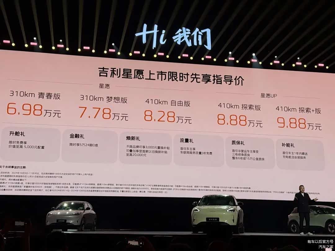 吉利星愿定位五门五座两厢车,车身尺寸为4135/1805/1570mm,轴距为2650mm。全系提供310km和410km两种续航版本,并分别匹配58kW和85kW后置单电机。