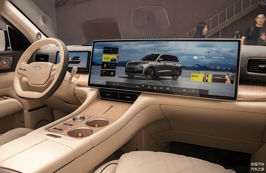 内饰部分,风云T11的设计也是非常地简单粗暴,直接给用上了一整块一体式的中控和副驾娱乐屏。据官方说法,这块屏幕的尺寸达到了30英寸,而且配有极窄边框。屏幕内也拥有像AI大模型语音助手等功能,至于实际表现如何,则有待后期体验。