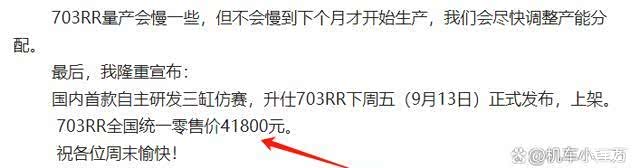 近日,升仕摩托的掌门人陶总亲自通过社交平台公布了全新703RR的官方售价——41800元,还配上了一段精彩的赛车视频,展示了这款备受期待的车型。要想观看原视频,大家可以移步升仕视频号一探究竟。而令人激动的是,703RR将在9月13日,也就是下周五的重庆摩博会期间正式发布,这个“恰到好处”的时机不禁让人怀疑是否是精心安排的巧合。