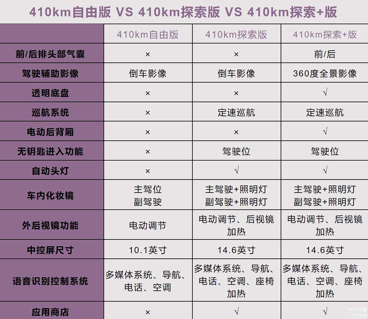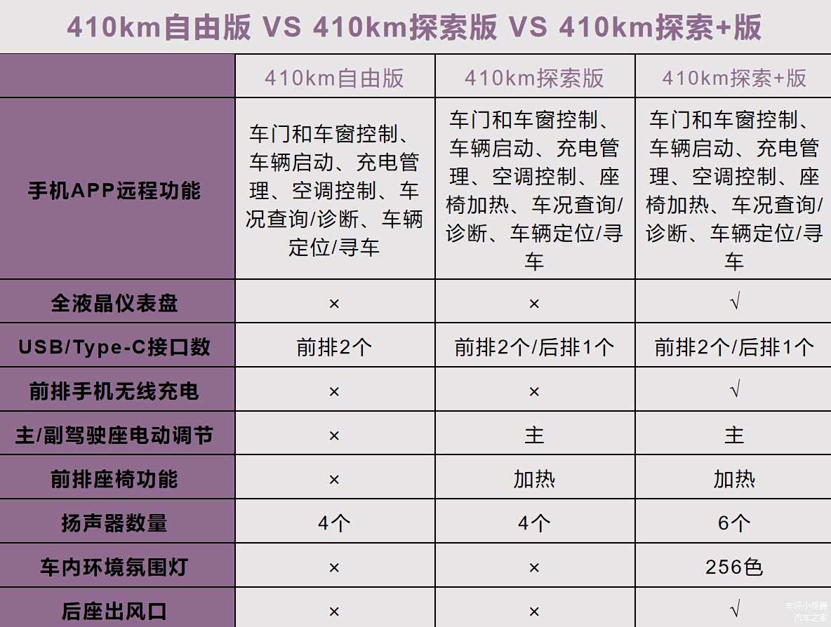 三款车在配置上的差别还是很大的,前/后排头部气囊、透明底盘、电动后背厢、全液晶仪表、前排手机无线充电、256色氛围灯、后座出风口等都是410km探索+版独有的配置。但410km探索版和410km自由版相比,配置也是很丰富的,多了定速巡航、自动头灯、应用商店、主驾驶位电动调节、前排座椅加热等,所以小编主推的是性价比较高的410km探索版,虽比410km自由版贵0.6万,但整体的体验感会不错。