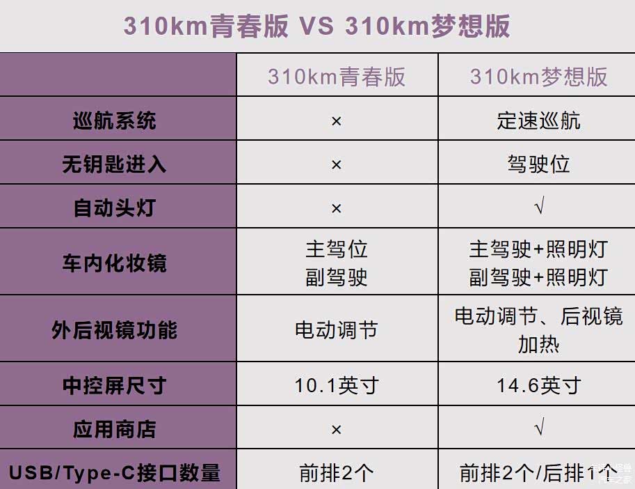 二者的差价是0.8万,310km青春版和310km梦想版相比,少了定速巡航、驾驶位无钥匙进入、自动头灯、应用商店等,小编还是推荐310km梦想版,虽是几千的差价,但整体的体验会更不错。