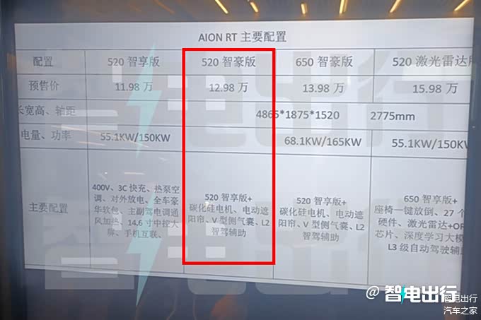 AION RT 520智享版主要配置400V平台、3C快充、热泵空调、对外放电、全车软包、主副驾电调座椅(带通风/加热)、14.6英寸中控屏和手机互联等。520智豪版较520智享版增配碳化硅电机、电动遮阳帘、侧气囊、L2级智驾辅助。650智豪版较520智豪版增配大电池和165kW高功率电机,工况续航里程增至650km。
