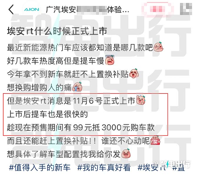 埃安体验店销售表示,AION RT将于11月6日上市,将加推520智豪版,预售价12.98万元(此前官方公布的4款车型预售价分别为:520 智享版11.98万元、650 智豪版13.98万元、520 激光雷达版15.98万元、650 激光雷达版16.98万元),限时下订享99元意向金抵扣3000元购车款。