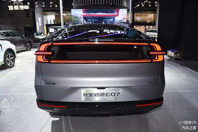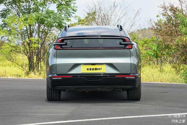 车尾部分,长安启源E07尾部使用了星环贯穿式尾灯组,并且宽大的车尾轮廓配合后包围底部大面积熏黑装饰件,使得该车尾部设计既另类又动感。