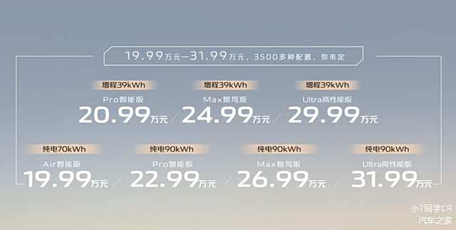 另外,增程39kWh Ultra高性能版四驱和纯电90kWh Ultra高性能版使用了21英寸轮毂(265/45 R21米其林静音胎)、其余版本车型使用20英寸轮毂(255/55 R20朝阳1号静音胎)。
