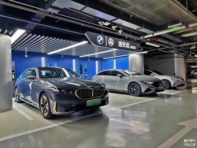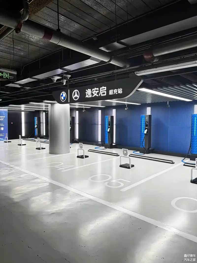 在北京蓝色港湾超充站,可见有明显的奔驰、宝马LOGO元素,预示着两品牌的新能源车主将有专属充电场站。当然,逸安启超充站不仅服务奔驰和宝马车主,也面向其他新能源品牌车主开放共享。