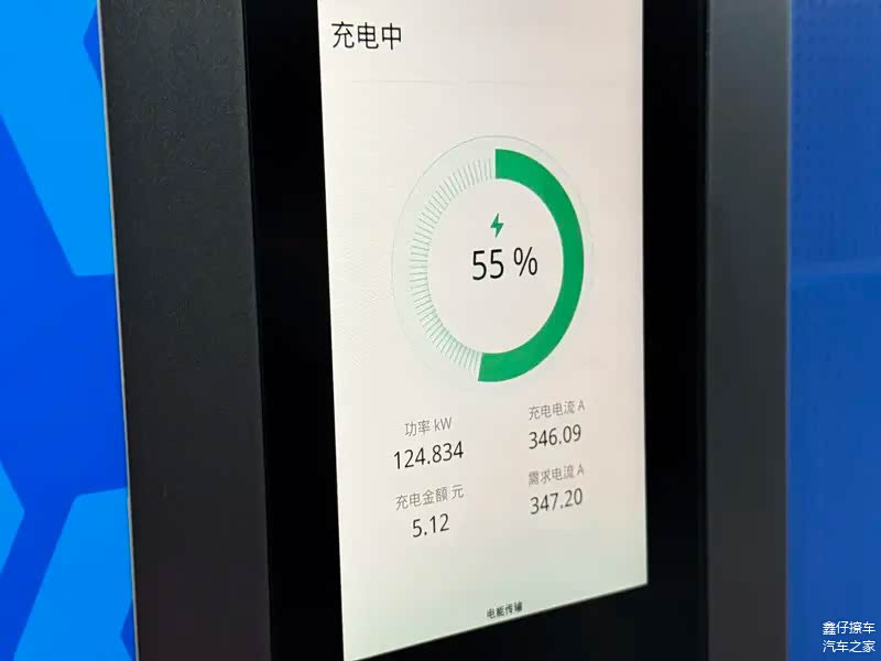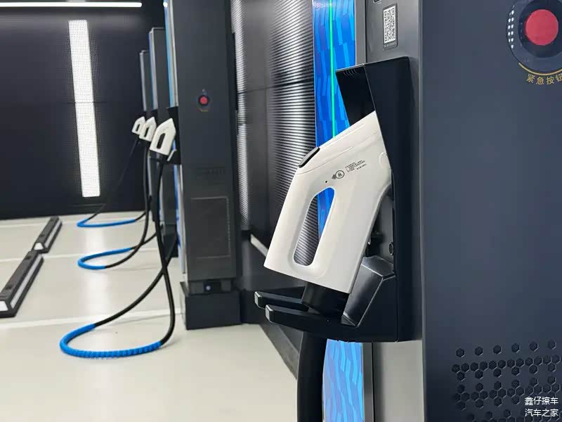 超充桩造型简约精致,采用了高识别度的蓝色外观,内嵌7英寸显示屏,显示车辆充电时的功率数据等信息,其枪身采用轻量化设计,便于车主操作。