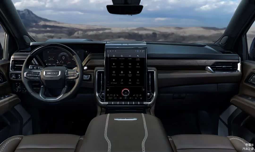 内饰方面,新车采用了很典型的美式全尺寸SUV风格,皮料堆满,能用皮质包裹的绝不用硬塑料,档次感不能低。另一个典型的就是硕大的中央扶手箱,上面都几乎可以放个茶台。AT4版和Denali版内饰差别也不大,AT4版方向盘为GMC logo,而Denali版还是印着Denali,16.8英寸纵向布局的中控屏放在YUKON上也不显大。
