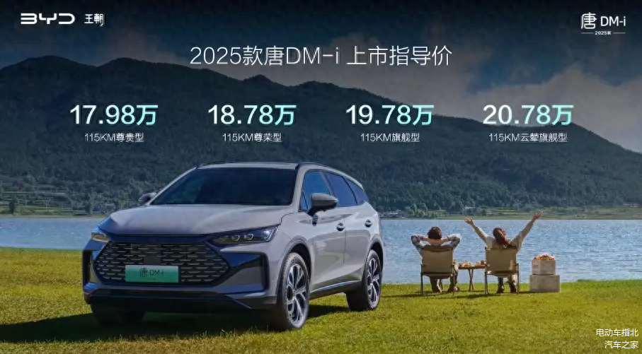 10 月 24 日,2025 款 比亚迪唐(图片 | 参数 | 询价) DM-i 正式上市,新车定位中型 SUV,搭载第五代 DM 技术,共推出 4 款车型,电池均为 21.5kWh,CLTC 纯电续航均为 115km,售价区间为 17.98-20.78 万元。