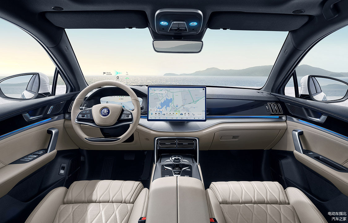 新车标配 12.3 英寸的仪表屏和 15.6 英寸的可旋转 LCD 中控大屏,支持 4 音区语音连续识别,唤醒词为“你好,小迪”。