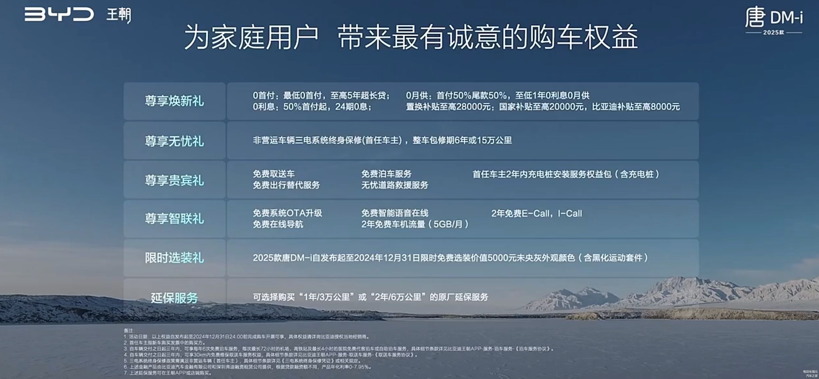 上市权益:支持 0 首付/0 月供/0 利息等多种金融方案(实际年利率 0-7.95%);首任非营运车主三电系统终身保修,整车包修期 6 年或 15 万公里;首任车主 2 年内免费安装充电桩;2 年内免费车机流量(5GB/月)。