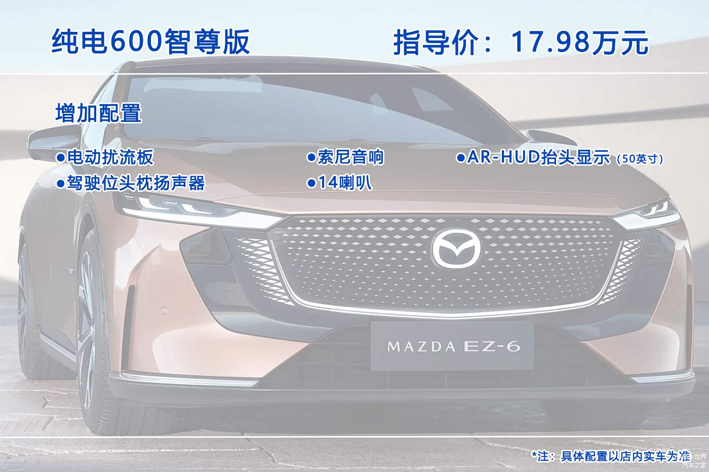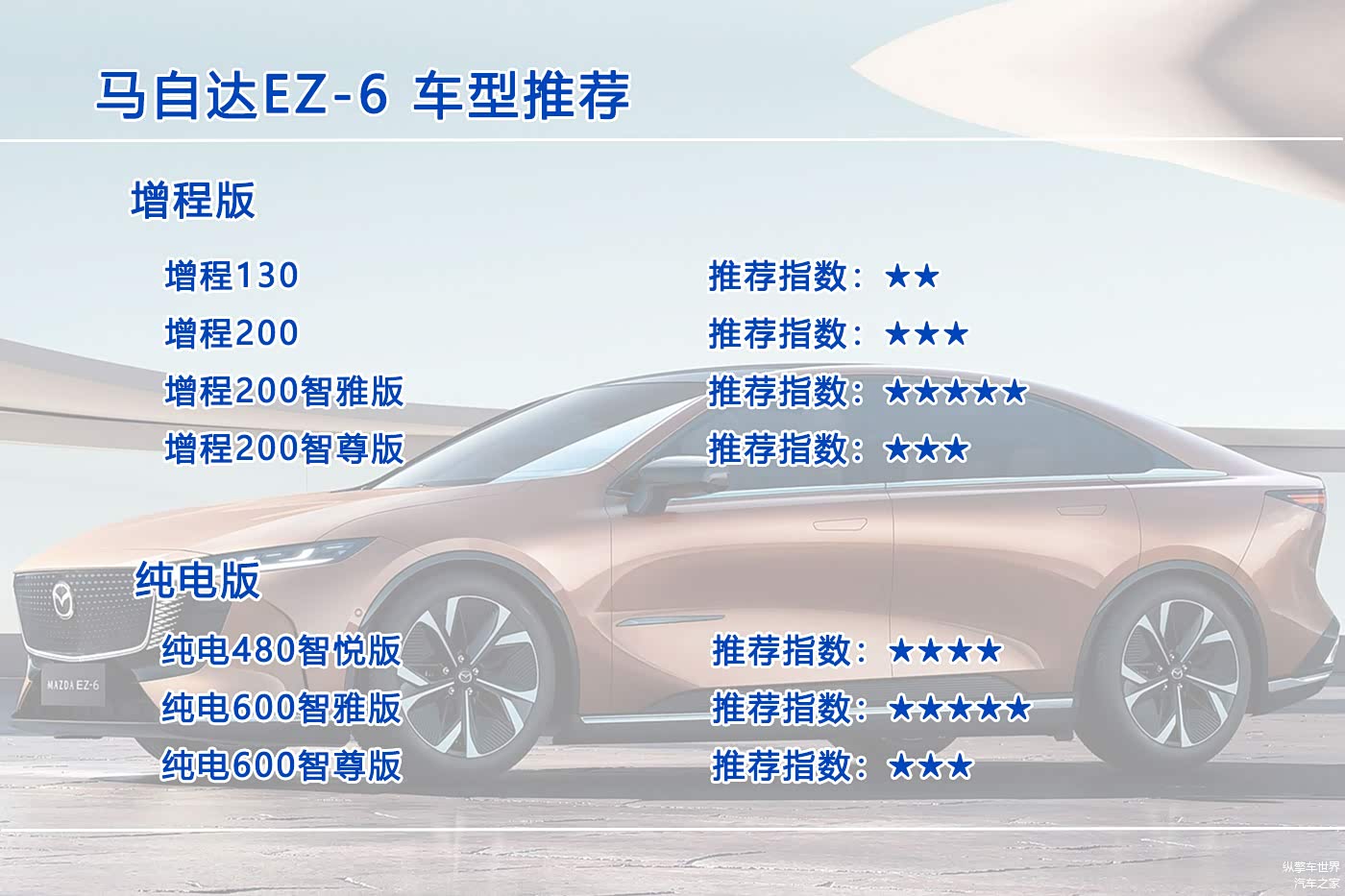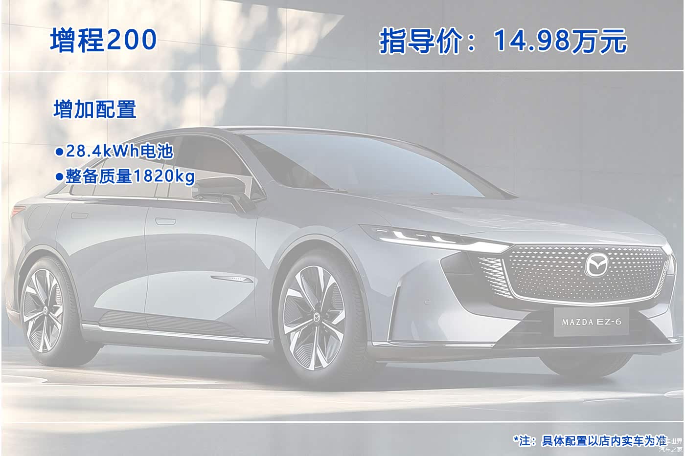 10月26日, 马自达EZ-6(图片 | 参数 | 询价)正式上市,这是一款中型轿车,提供增程版和纯电版共7个配置车型可选,售价区间为13.98-17.98万元。那么这七个配置车型究竟哪个更值得入手呢?今天我们就来聊聊这个问题。