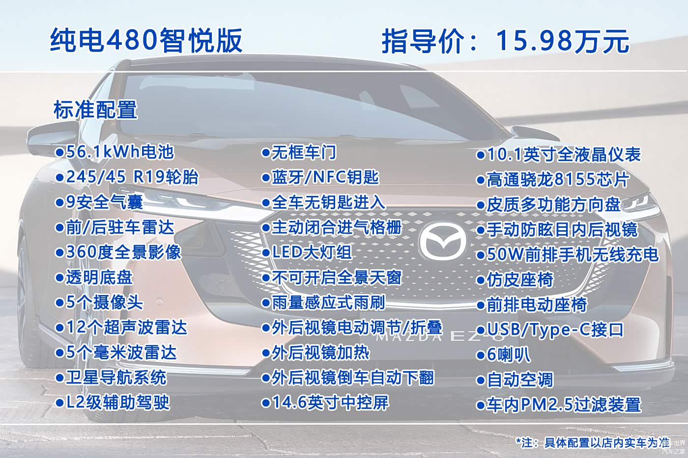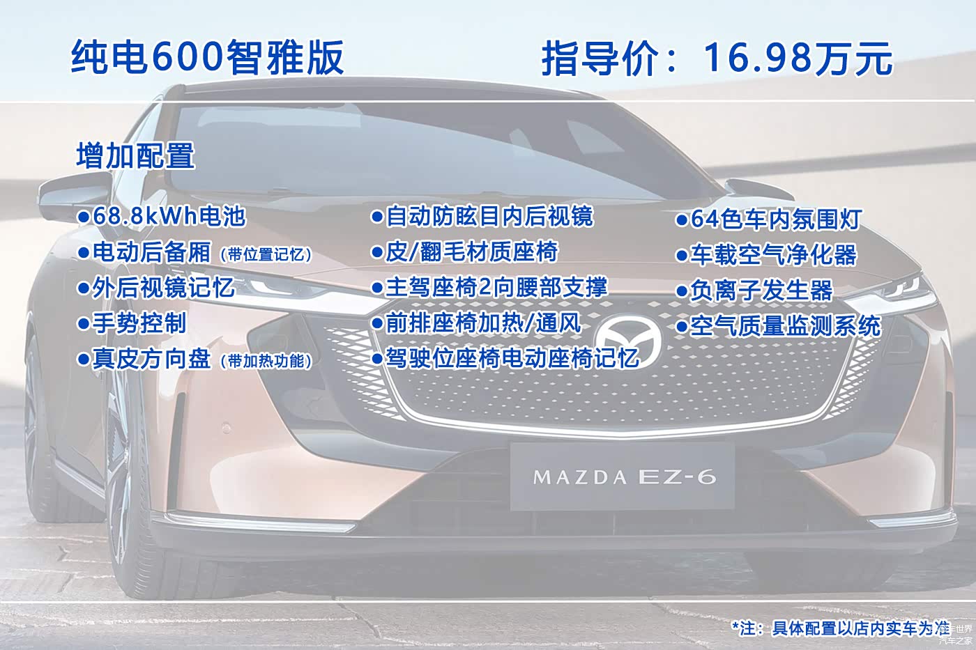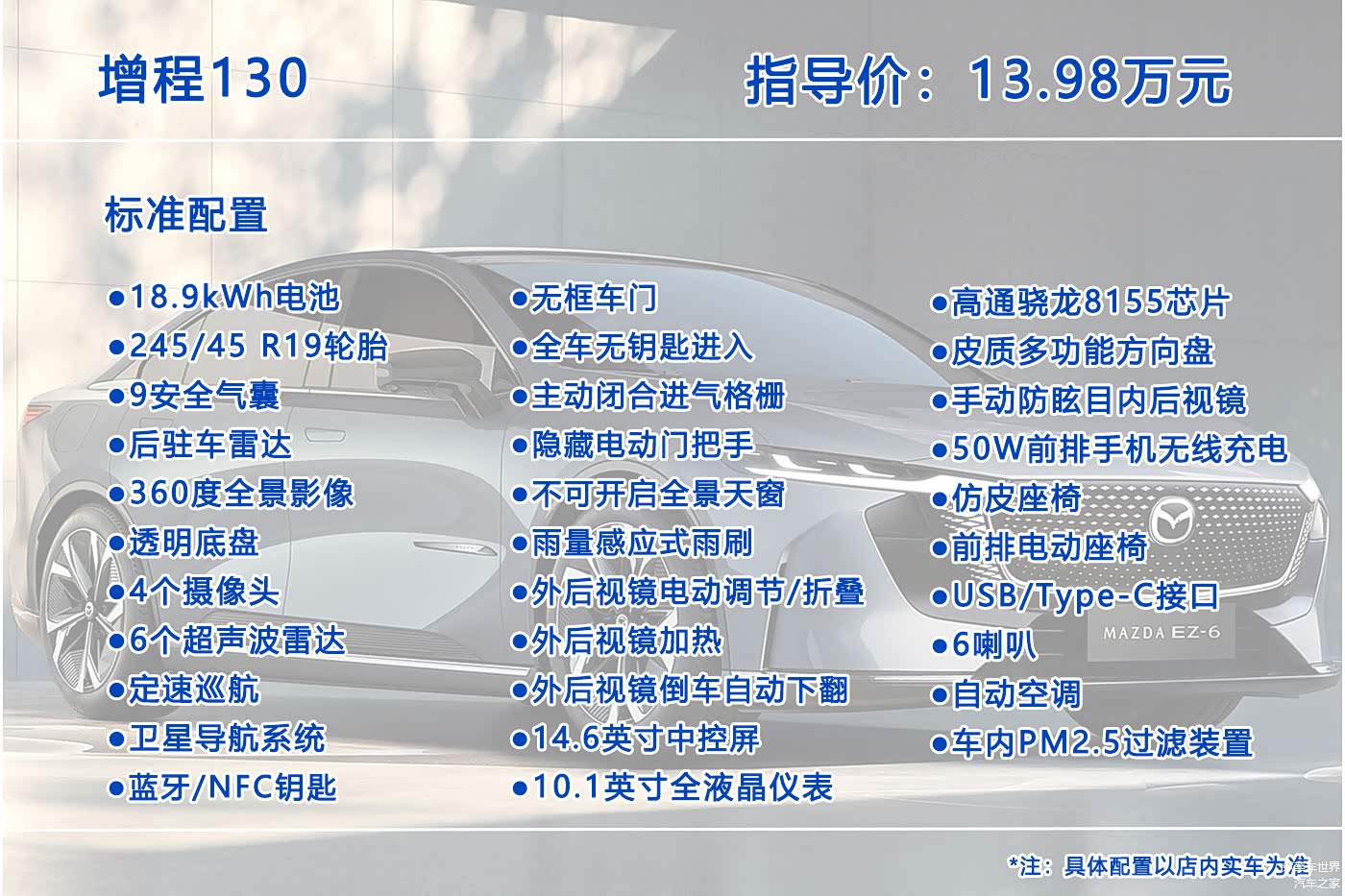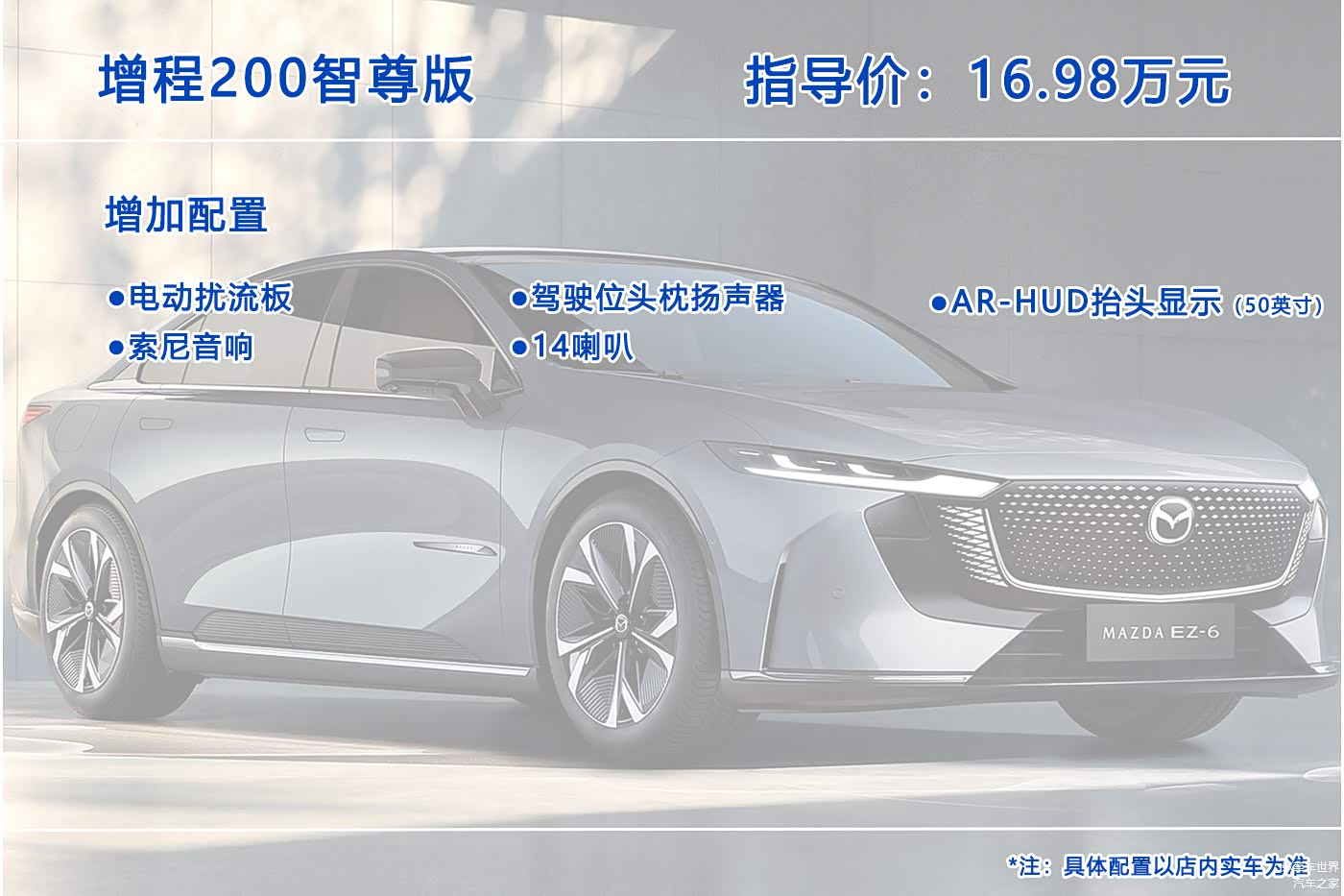 10月26日, 马自达EZ-6(图片 | 参数 | 询价)正式上市,这是一款中型轿车,提供增程版和纯电版共7个配置车型可选,售价区间为13.98-17.98万元。那么这七个配置车型究竟哪个更值得入手呢?今天我们就来聊聊这个问题。