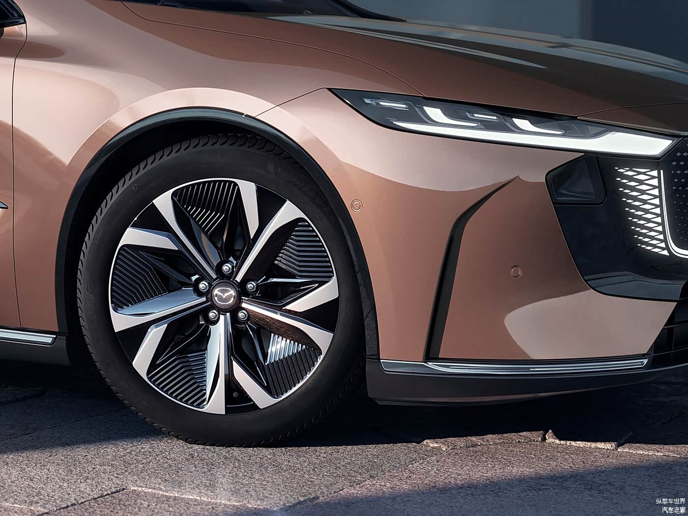 马自达EZ-6继续采用家族式的魂动设计理念,纯电版和增程版在前脸的设计上略有差异,前者为封闭格栅,后者为常规格栅,内部都是点阵式中网和可发光LOGO。新车配备了造型狭长的前大灯组,造型比较犀利。