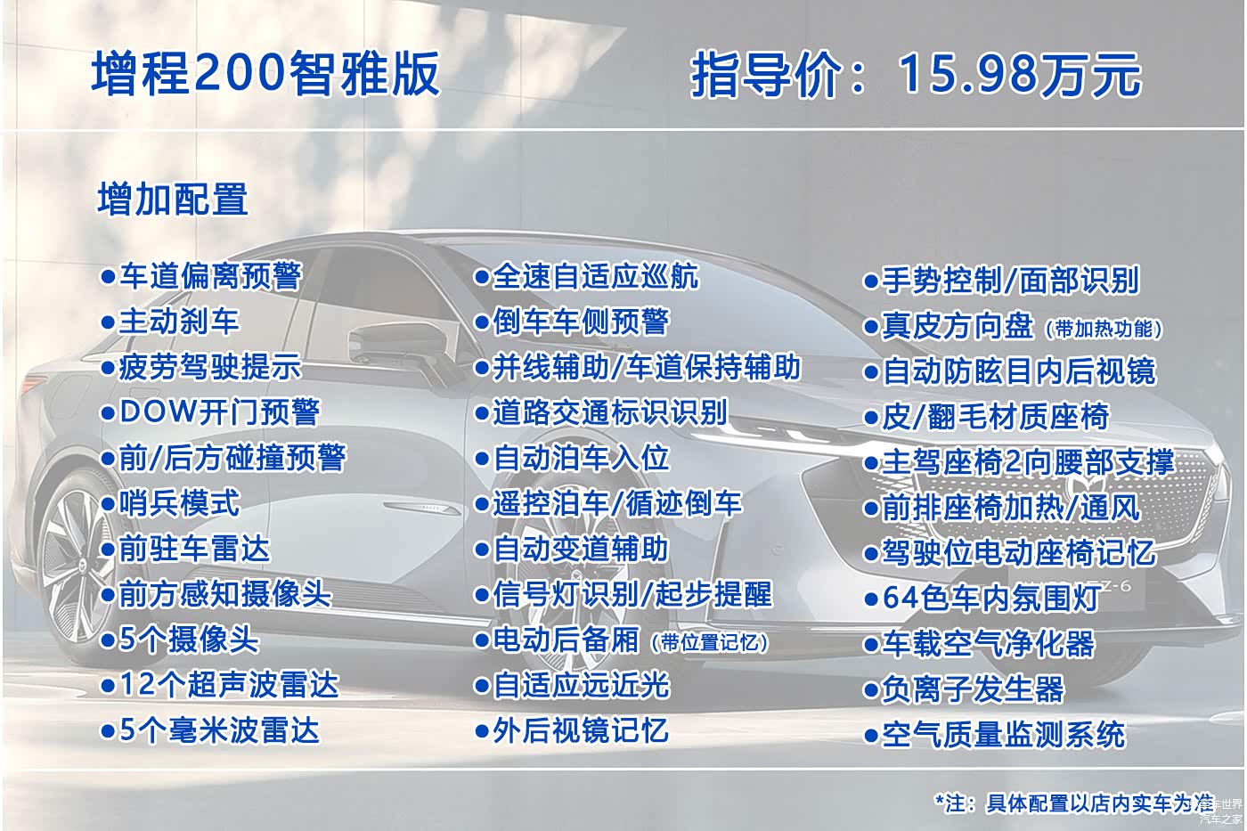 增程200智雅版比增程200版本配备了更多的硬件,因此智驾方面有了明显的提升,辅助驾驶达到了L2级,另外该版本还增加了电动后备厢、面部识别、手势控制、真皮方向盘、NAPPA真皮座椅、前排座椅加热/通风、64色车内氛围灯、车载空气净化器等配置,价格也只比增程200版本贵了1万元,可以说是物有所值,个人认为是最值得推荐的版本。