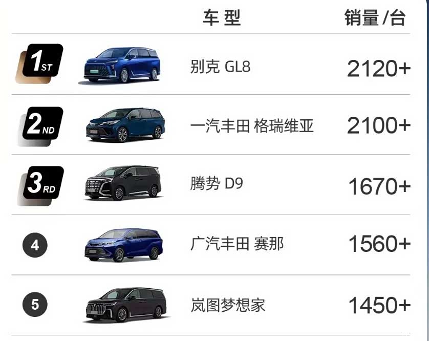 在刚刚过去的9月,腾势终端销量6520台,不敌别克GL8、丰田赛那及格瑞维亚,屈居第四位。而最新的10月第二周销量,腾势D9销量1670辆,排在别克GL8、丰田格瑞维亚之后。
