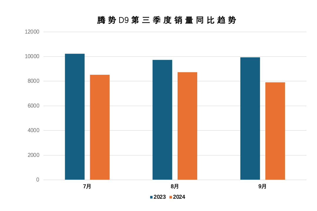 今年第三季度,腾势D9销量连续3个月同比下跌,跌幅分别为16.7%、10.4%和20.3%。