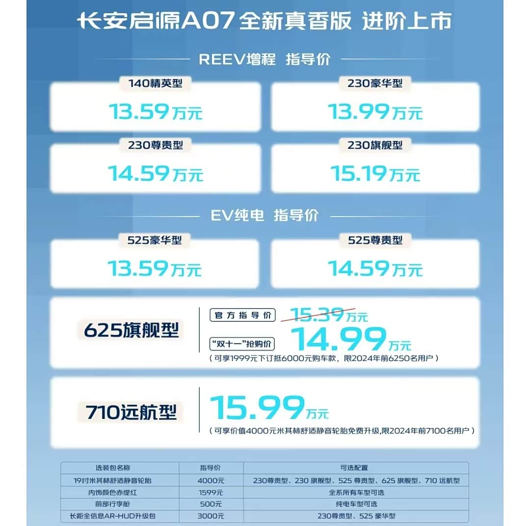 价格方面,625旗舰型官方指导价为15.39万元,同时该车型还提供“双十一抢购价”,也就是今年内前6250名下单的用户可以享受1999元下订抵扣6000元购车款的权益,相当于实际价格为14.99万元;而710远航版定价为15.99万元,没有现金优惠,但前7100名下单的用户可以免费升级米其林舒适静音轮胎。