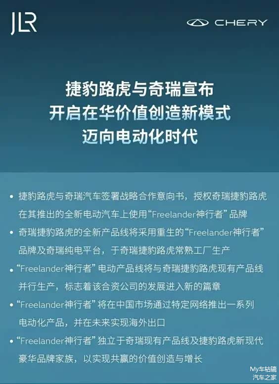 在过去的三年里,捷豹路虎一直在为电气化转型做准备,并选择了更快速的方案。今年6月份,捷豹路虎中国宣布与奇瑞汽车签署战略合作意向书,授权奇瑞捷豹路虎在其推出的全新电动汽车上使用“Freelander·神行者”品牌。这可以说是捷豹路虎在华转型道路上的全新篇章。