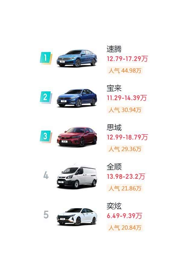 宝来在紧凑型车市场中人气持续走高,排名第二。其设计精巧,外观时尚,内饰豪华科技感强,配备智能导航、倒车影像等科技配置,提供舒适的驾乘体验。动力输出平稳,加速迅猛,同时燃油经济性优秀。宝来价格亲民,指导价在11.29-14.39万之间,深受消费者喜爱。