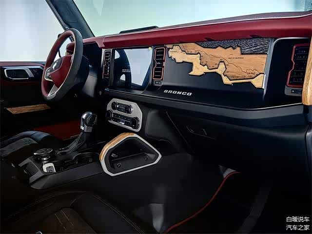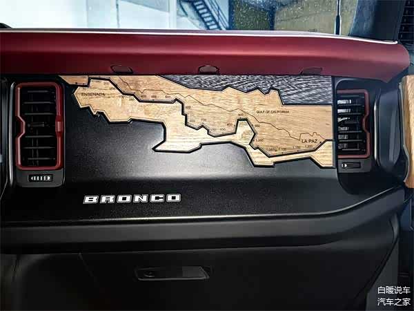 巴哈版的副驾驶仪表台装饰板以巴哈赛事路程的地图为灵感,通过多种实木拼接镶嵌的方式来继承和转化原生的设计语言,达到感官与质感上的双向提升。“1967”座椅标识意义非凡,致敬的正是第一代烈马首次获得 Baja1000 赛事冠军,座椅皮料纹路以 2023 福特 Bronco 冠军车轮胎花纹为灵感,让每位用户在驰骋的路上,都能感受到巴哈之王的超凡气质。