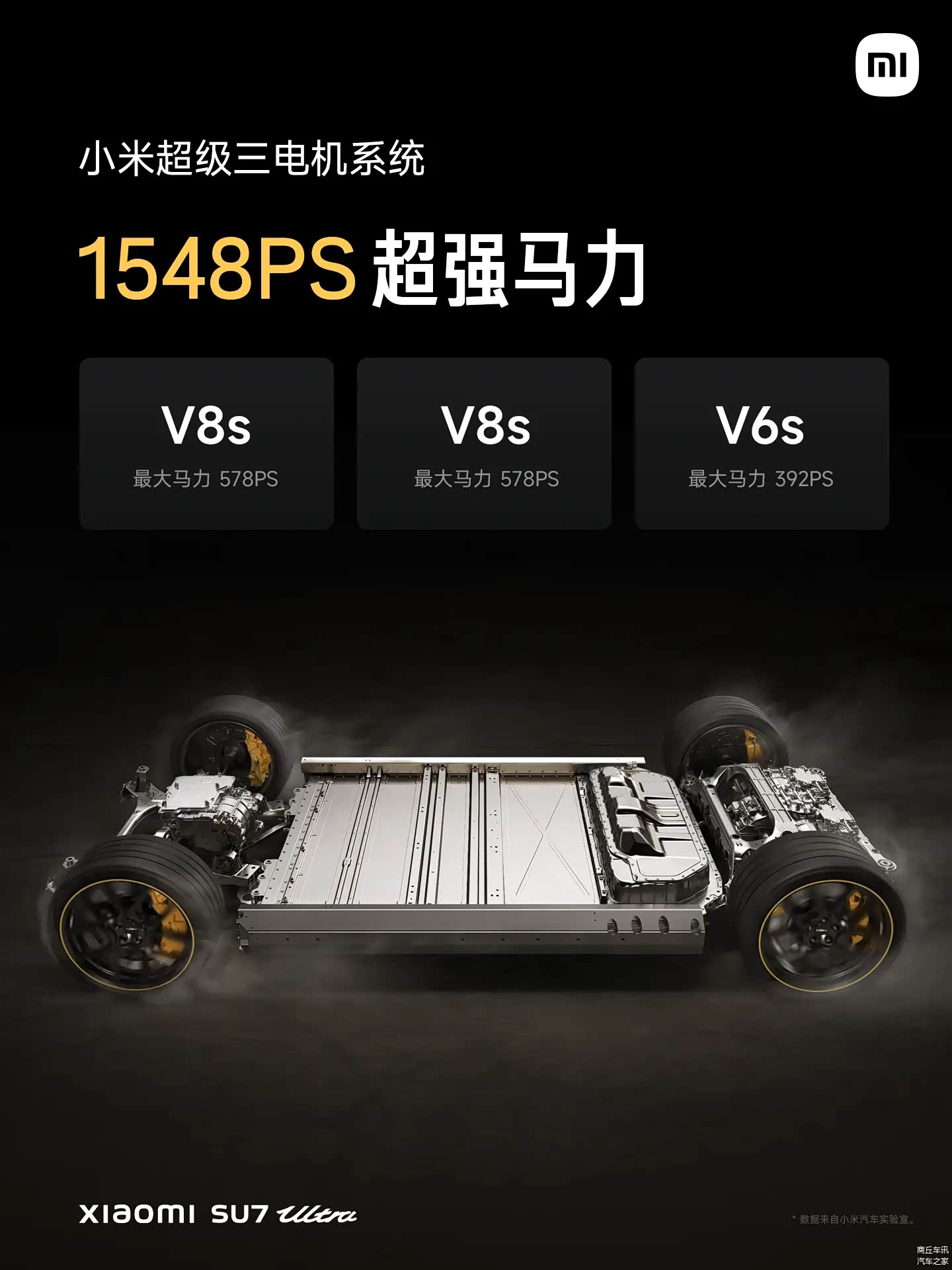 在动力方面,小米SU7 Ultra搭载了与原型车相同的超级三电机系统——两台V8s电机和一台V6s电机。这是小米自研的超级电机V8s首次正式量产上车,其最高转速可达27200rpm,是目前转速最高、性能最强的量产主驱电机。动力系统的最大马力达到1548PS,0-100km/h加速仅需1.98秒(不含起步时间),这样的加速性能足以让任何一款传统超跑黯然失色。