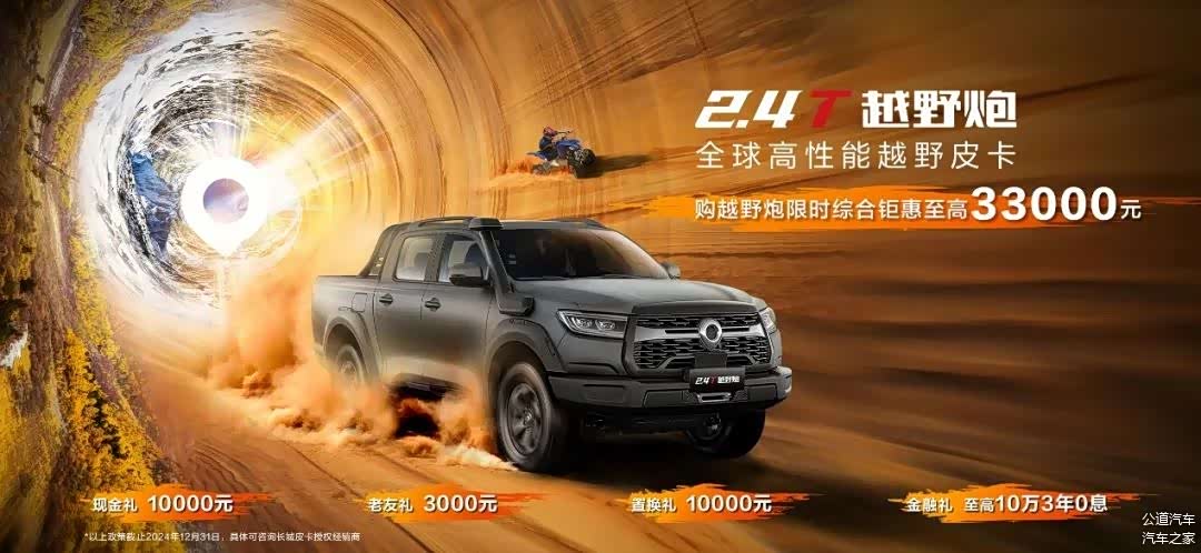 现在购买越野炮,限时综合钜惠至高33000元,尊享10000元现金礼、3000元老友礼(长城车主增购/换购及其他品牌皮卡车主换购可享)、10000元置换礼、至高10万3年0息金融礼等政策。