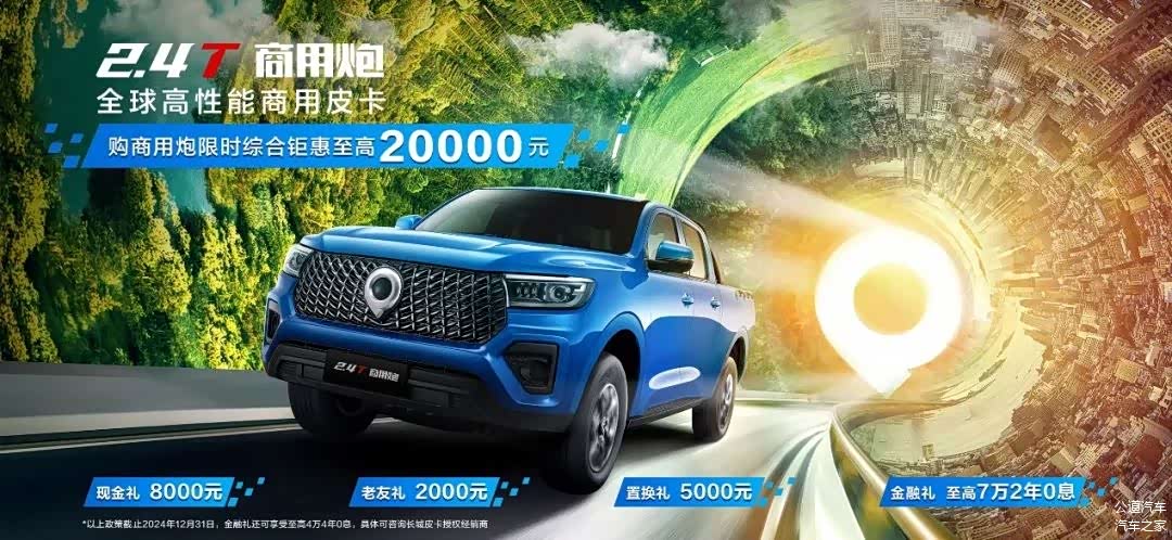 现在购买乘用炮、商用炮,限时综合钜惠至高20000元,尊享8000元现金礼、2000元老友礼(长城车主增购/换购及其他品牌皮卡车主换购可享)、5000元置换礼、至高7万2年0息/4万4年0息金融礼等政策。