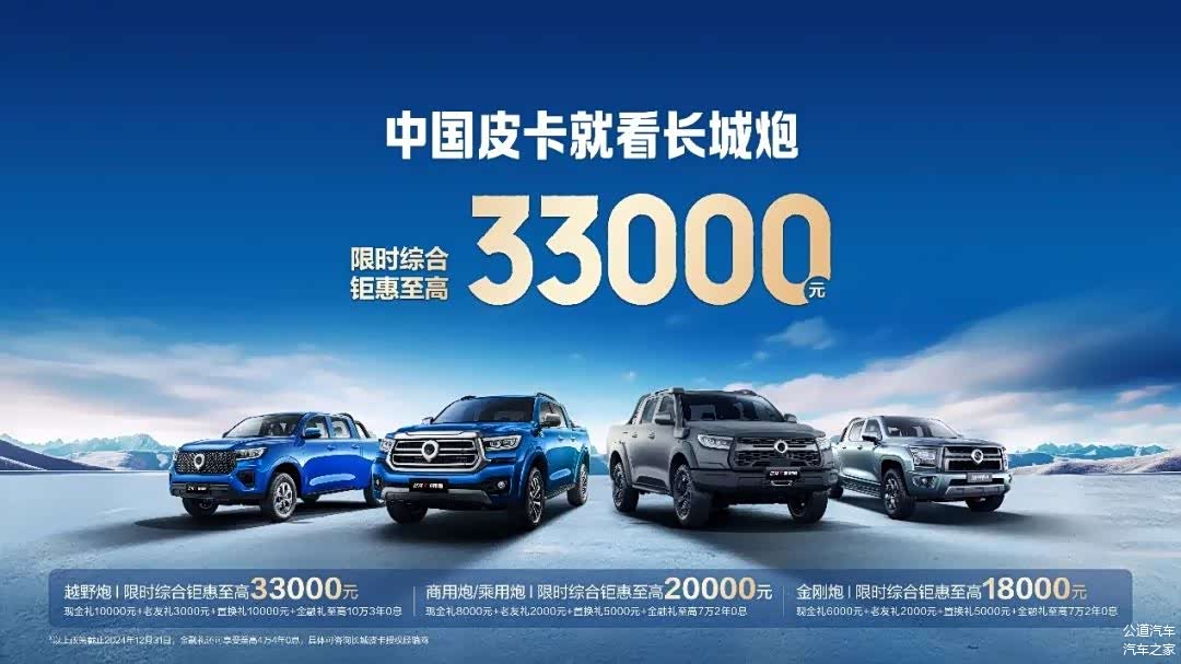 为感恩回馈广大用户的支持与信赖,长城炮品牌年终钜惠活动强势来袭。即日起至12月31日,购买长城炮旗下车型享限时综合钜惠至高33000元。作为皮卡新品类开创者,长城炮持续践行品类创新,目前已形成时尚商用和乘用休闲两大品类,推出精准适配乘用、商用、越野等不同场景的高价值皮卡,已实现10万-30万价格带产品覆盖。