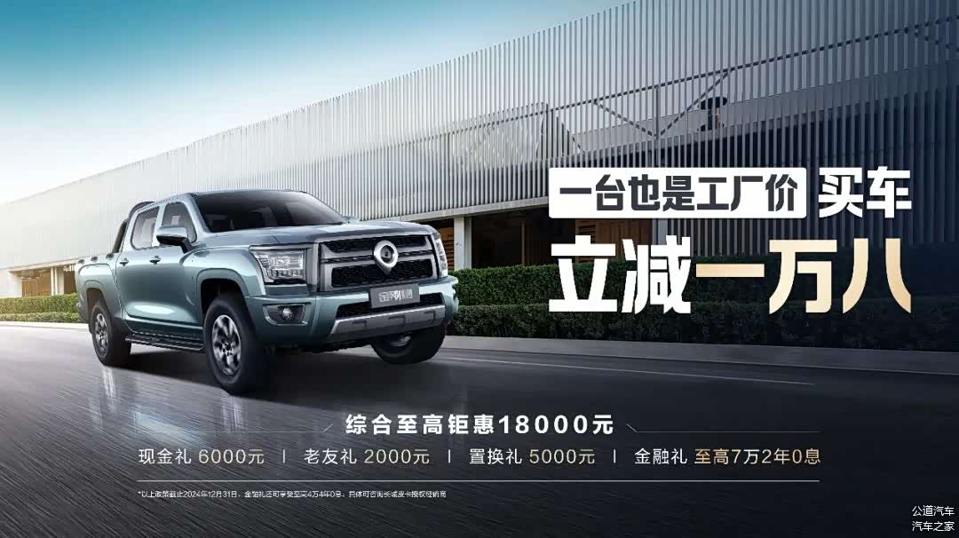 一台也是工厂价,买车立减一万八!现在购买金刚炮,限时综合钜惠至高18000元,尊享6000元现金礼、2000元老友礼(长城车主增购/换购及其他品牌皮卡车主换购可享)、5000元置换礼、至高7万2年0息/4万4年0息金融礼等政策。