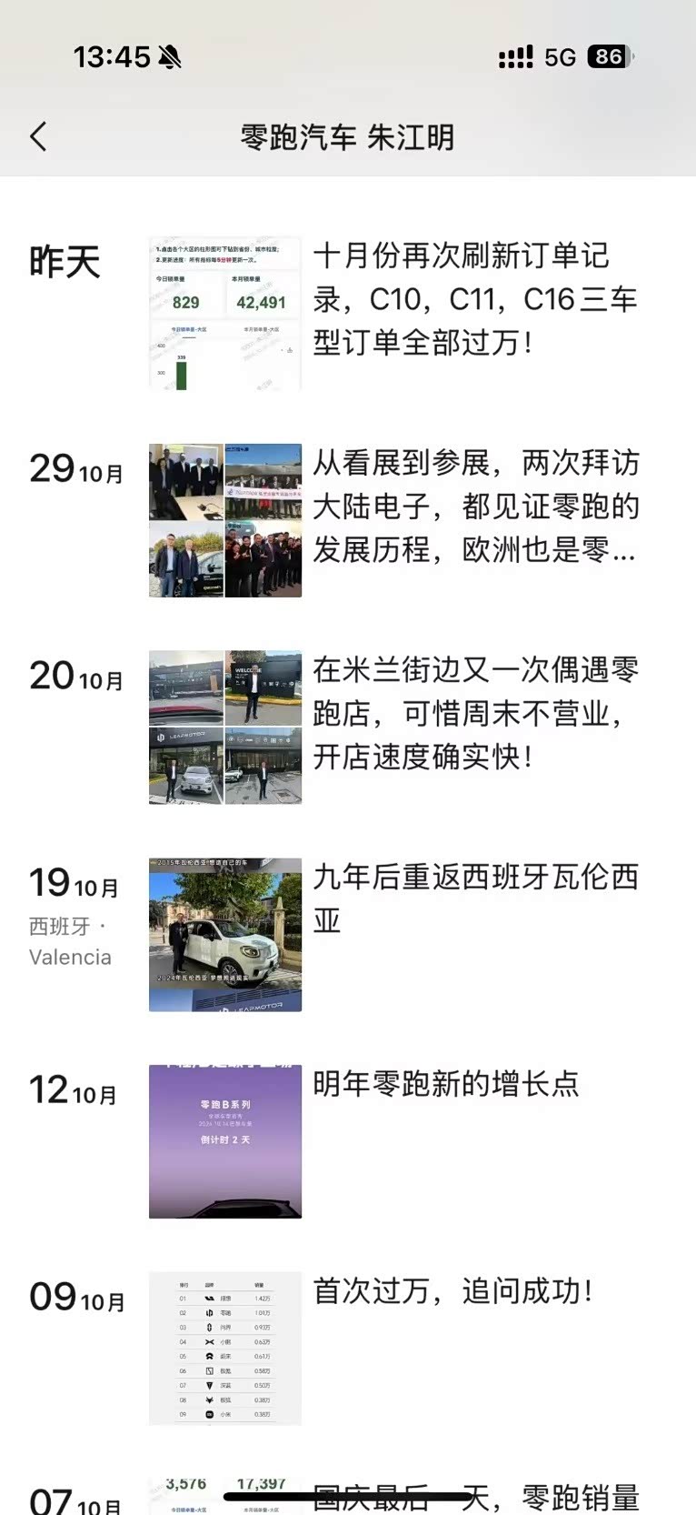 10月31日晚间,零跑汽车创始人朱江明便发布了本月的第9条朋友圈:十月份锁单量42491辆,再次刷新订单记录,C10、C11、C16三车型订单全部过万。回看整个十月,朱江明分享的朋友圈,一方面零跑汽车销量屡创新高,另一方面在全球化的道路上又迈出了关键一步,朱江明也在自己梦开始的地方完成了圆梦,完成了造车梦想的“闭环”。