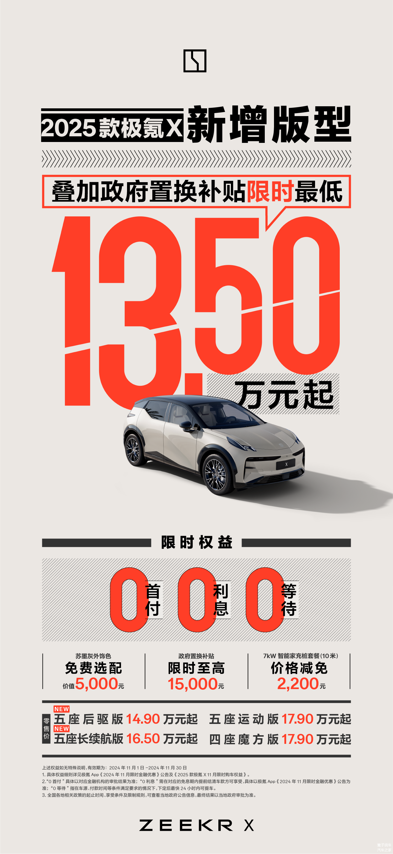 11月1日,极氪公司正式发布了2025款的 极氪X(图片 | 参数 | 询价)新款版型,与此同时,老款车型的售价也进行了相应调整。预计新车将推出5款,价格范围在14.90至19.90万元之间,加上政府提供的置换补贴,限时最低售价将从13.50万元开始。