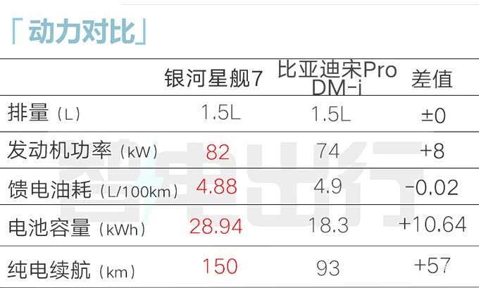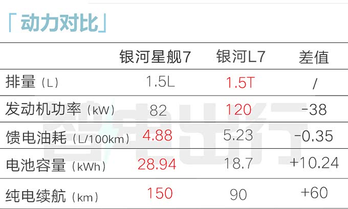 银河星舰7 EM-i基于GEA架构打造,搭载1.5L插电式混合动力系统,发动机最大功率82kW,采用单挡混动变速器,匹配19.09/28.94kWh磷酸铁锂电池组,工况纯电续航分别为101km和150km,百公里馈电油耗分别为4.85L和4.88L(WLTC工况)。