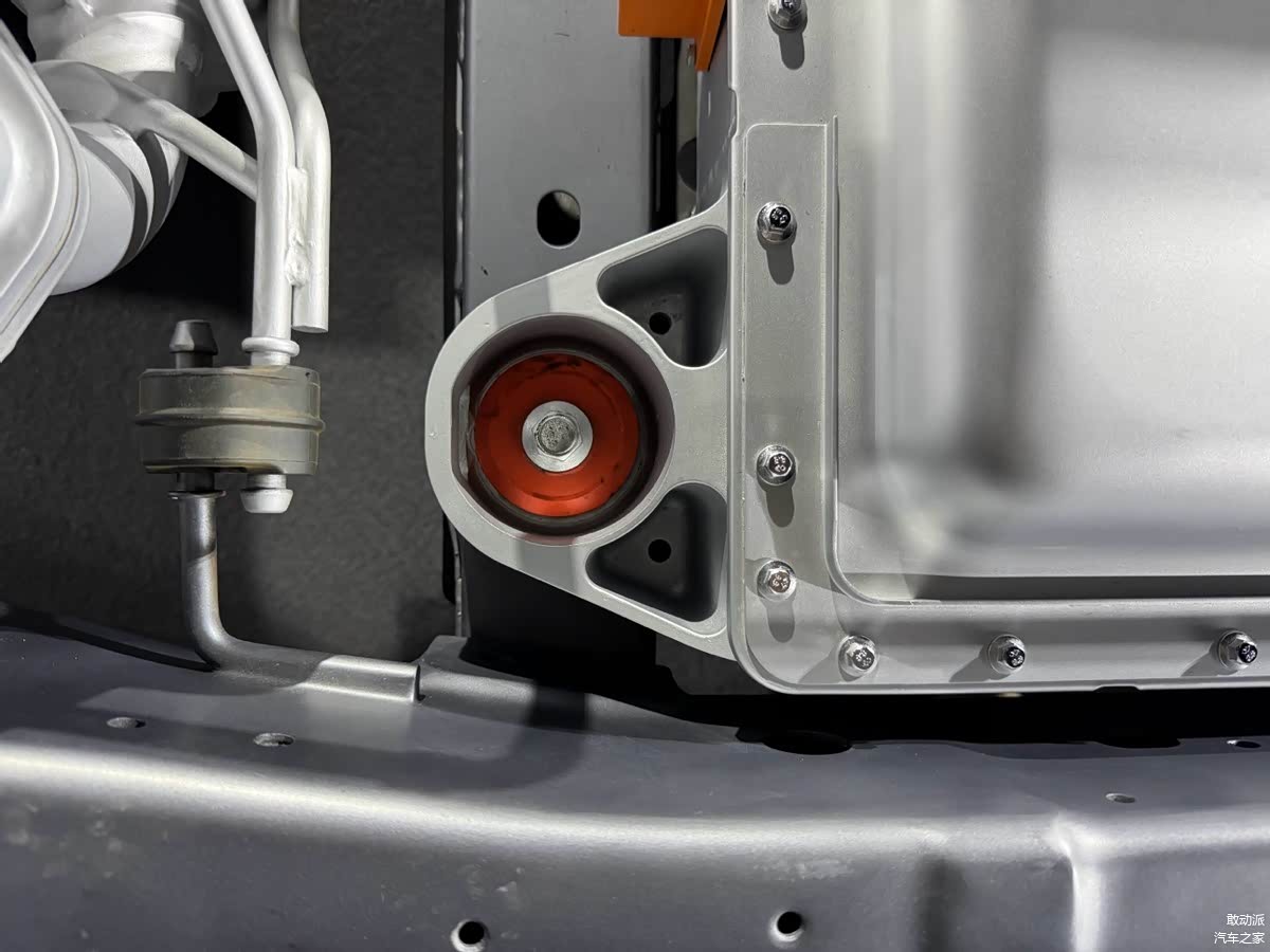 现在在我们面前呈现的就是BJ60雷霆的整个底盘台车结构,这次咱们主要关注电池包的安装方式。不同于其他厂家把电池包以焊接等硬连接的方式镶死在大梁上,BJ60雷霆的电池包安装方式则是类似于悬吊的模式,通过一些个脚垫、机脚来把电池架好。这样的好处在于电池包万一有个三长两短,只要拆下机脚就可以将电池包落地进行维修,属于是一种别出心裁的安装方法。